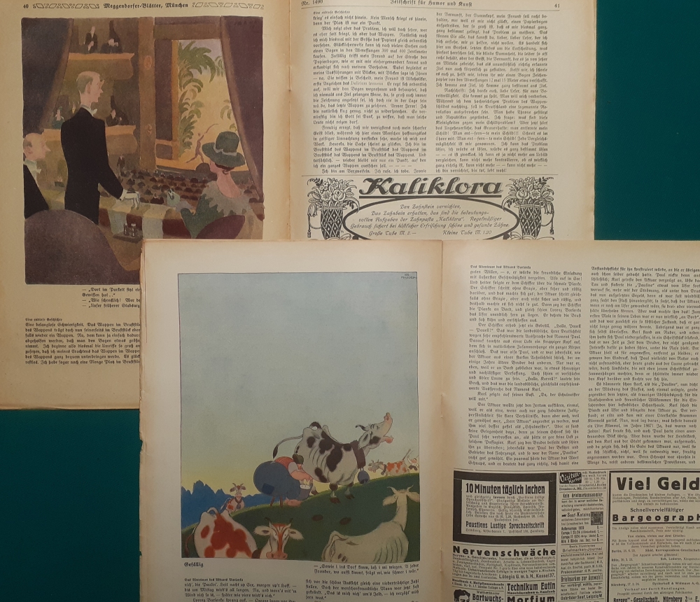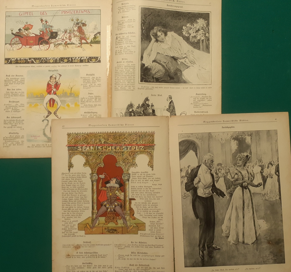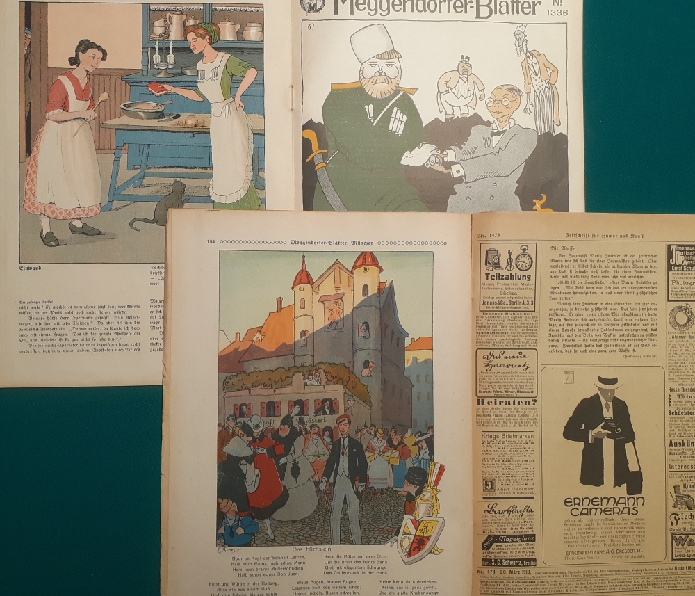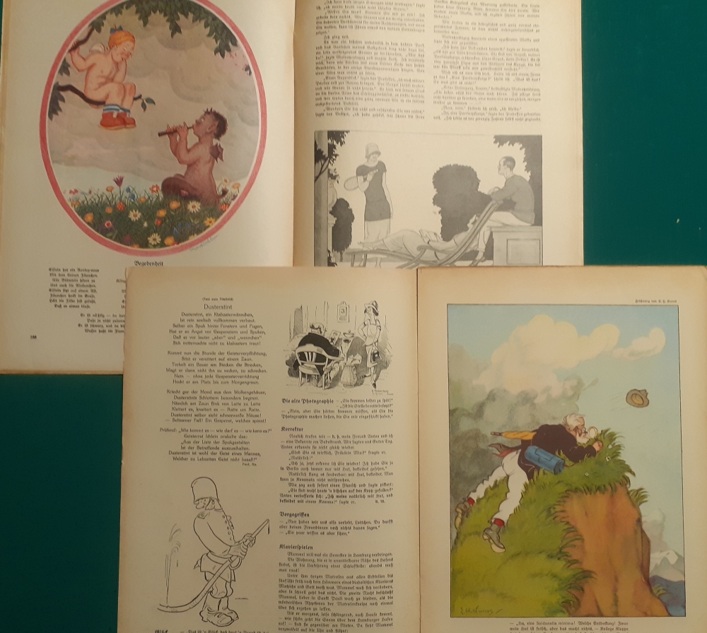 1315 | 9.3.1916 | Edmund Kreusch: Das Quartier bei der siebenten Bitt´; Nach Weihnachten; Schüttelreim ... | Beilage: 4 Seiten "Kriegschronik der Meggendorfer-Blätter": Das sind 4 Umschlagseiten mit satirischen Beiträgen zum Kriegsgeschehen; Umfang ca. 20 Seiten; mit sehr viel wunderbarer zeitgenössischer Werbung; sehr guter altersgemäßer Zustand | 9 |