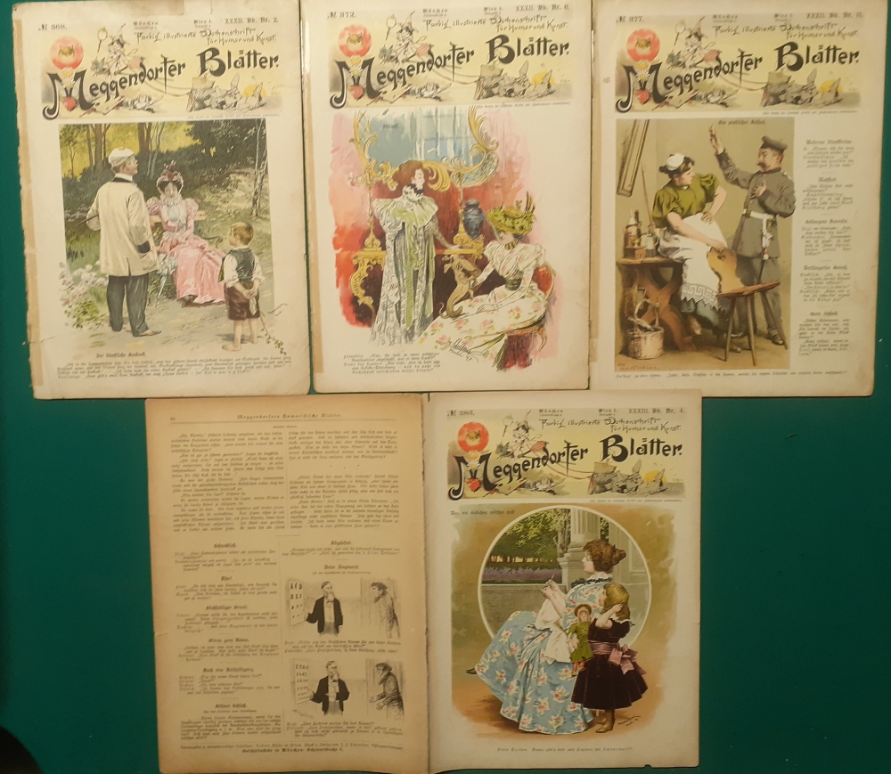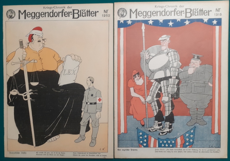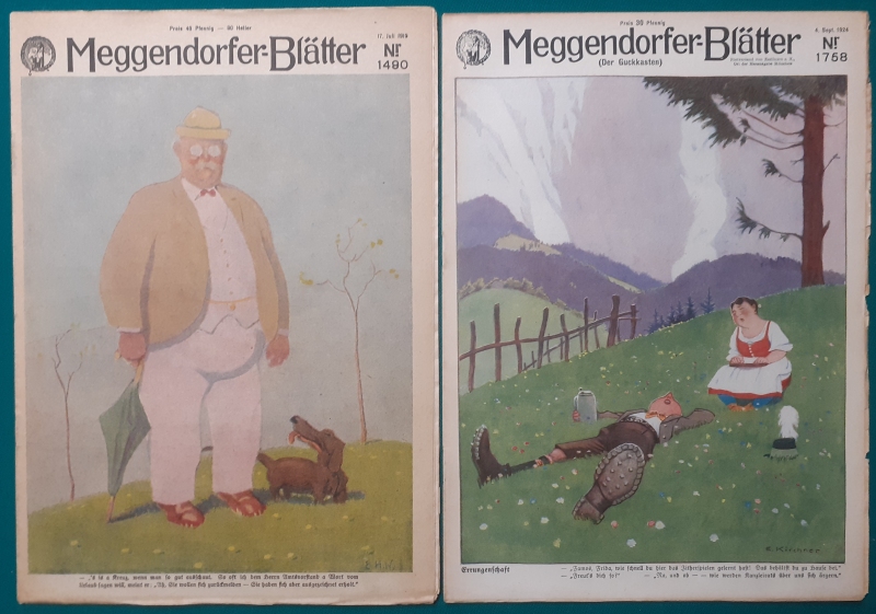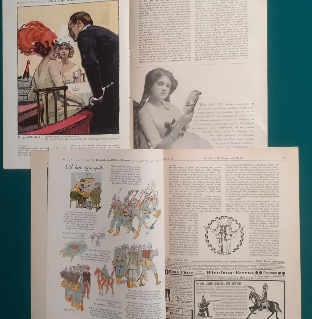1252 | 24.12.1914 | Klaus und Hein; Gipfel der Gutmütigkeit v. E. A. Hennig; So viel ... v. Peter Robinson; Daheim v. J. Mitteregger; Die Katastrophe v. L. Engel ... | Beilage: 4 Seiten "Kriegschronik der Meggendorfer-Blätter": Das sind 4 Umschlagseiten mit satirischen Beiträgen zum Kriegsgeschehen; Umfang ca. 20 Seiten; mit sehr viel wunderbarer zeitgenössischer Werbung; sehr guter altersgemäßer Zustand | 9 |