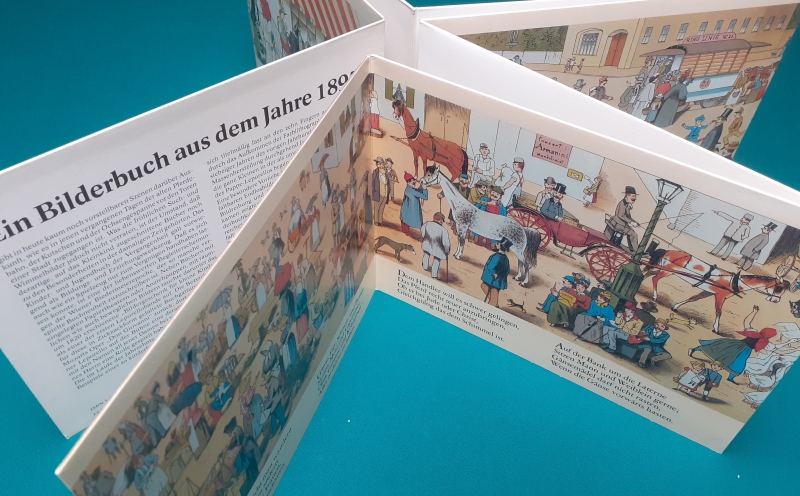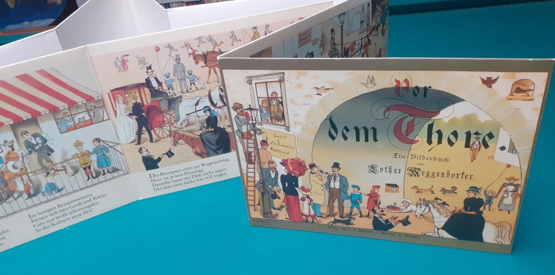 Lothar Meggendorfer: Vor dem Thore Schreiber Verlag Esslingen, Faksimile der alten Ausgabe von 1893, Neuerscheinung um 1990, Format Höhe: 22cm, jede Szene ca. 30 cm lang; die acht aufklappbaren Seiten sind alle in gutem Zustand; nichts gerissen oder verknickt, Buch insgesamt in sehr gutem altersgemäßen Zustand, auf der Rückseite der aufklappbaren Seiten ist ein Fachaufsatz von Hildegard Krahé über dieses alte Bilderbuch-Genre abgedruckt. Zum Inhalt: Preis: 12 EUR |
