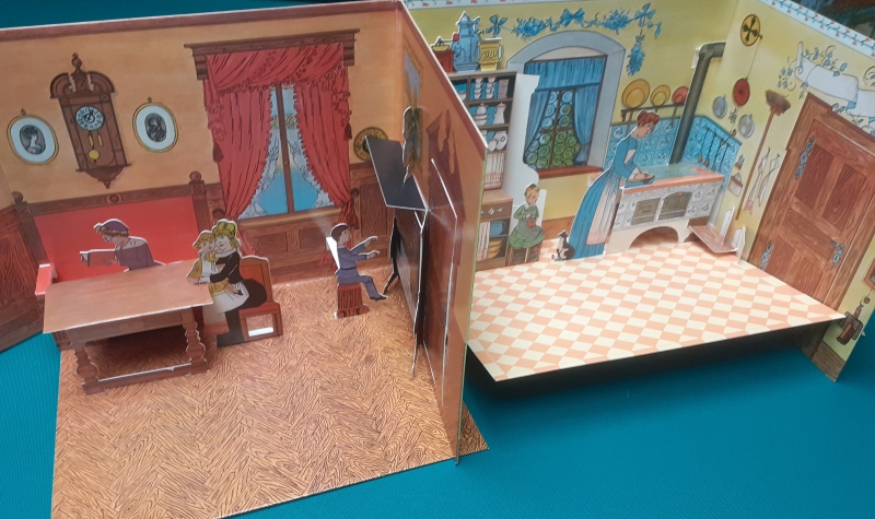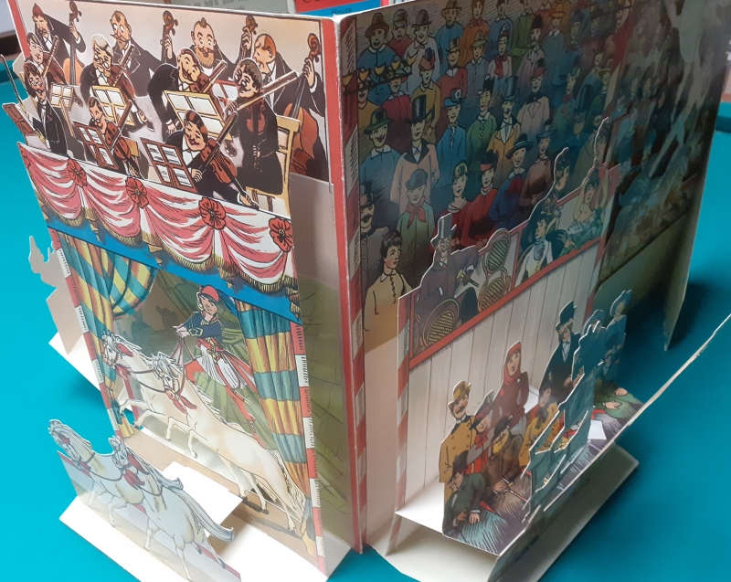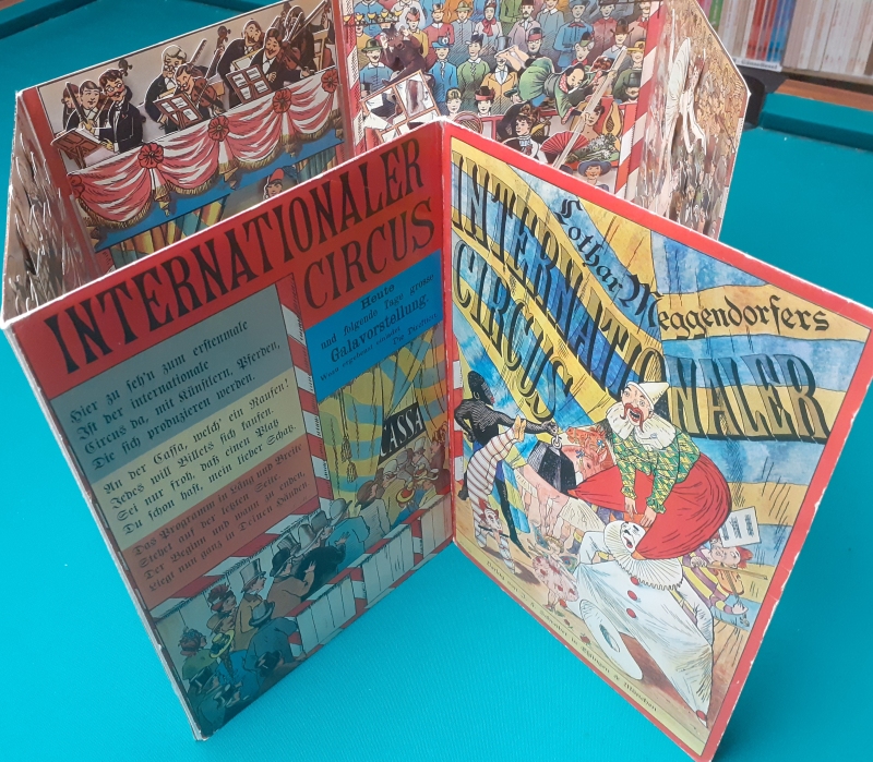 Meggendorfer: Schreiber Verlag Esslingen, Faksimile der Ausgabe um 1887, Neuerscheinung etwa um 1980, Format Höhe: 33 cm, Breite voll ausgeklappt: ca. 130 cm; die sechs aufklappbaren dreidimensionalen Seiten sind alle in gutem Zustand: nichts gerissen oder verknickt, an den Buchkanten bestoßen; insgesamt in gutem altersgemäßen Zustand, Preis: 19 EUR |