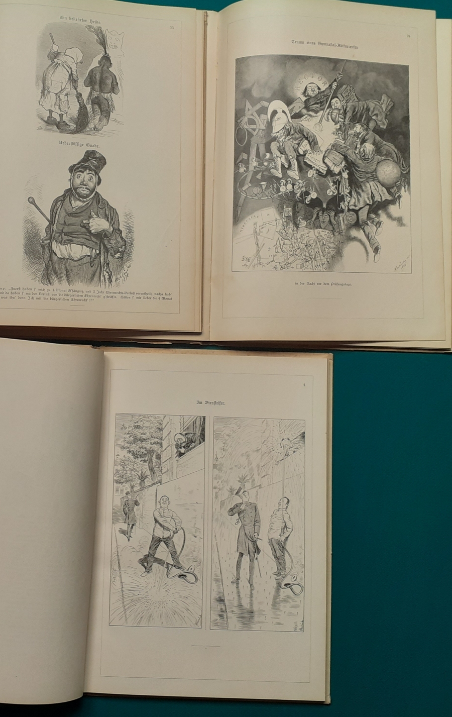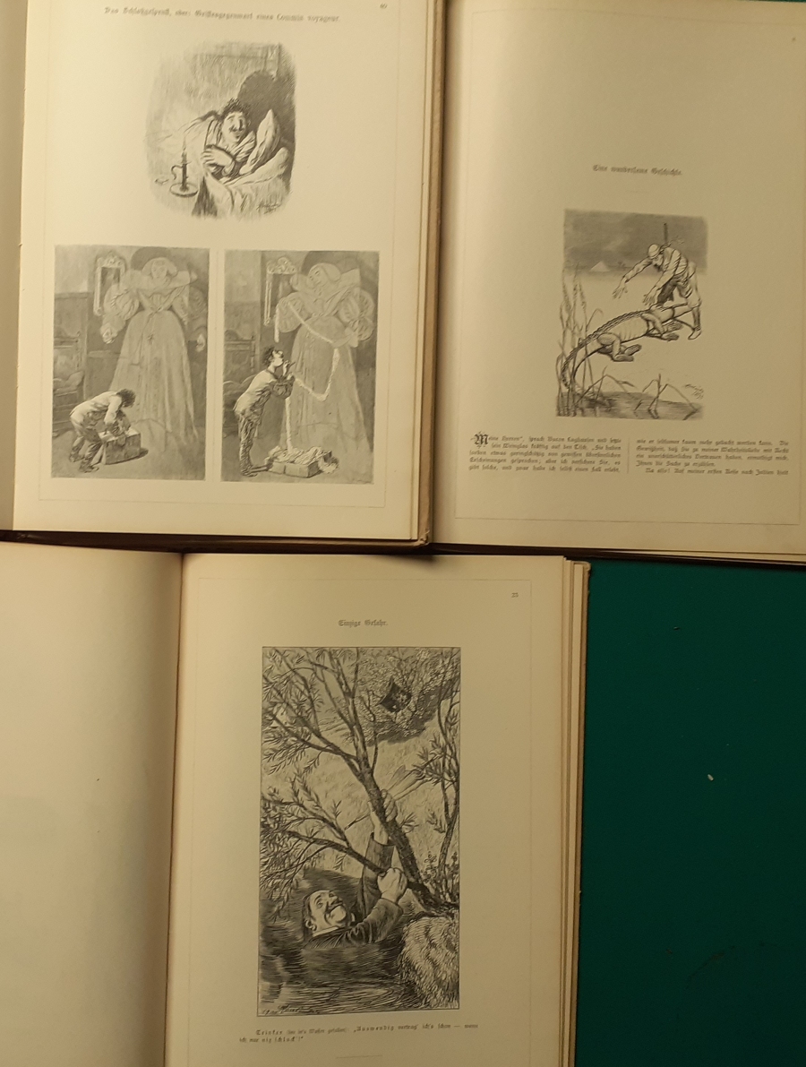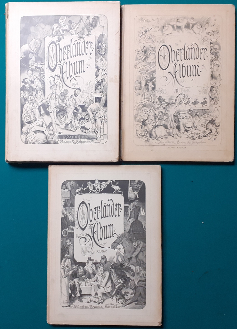 Adolf Oberländer (geb. am 1. Oktober 1845 in Regensburg; gest. am 29. Mai 1923 in München) war ein bayerischer Maler und Zeichner. Er war verheiratet mit Anna Elisabetha Johanna Helene Sophie Scheurlin (* 12. August 1844). Wilhelm Busch beeinflusste seine Illustrationen, die zum Großteil im Verlag Braun & Schneider erschienen. Bekannt waren vor allem seine humorvoll-satirischen Darstellungen menschlichen Verhaltens. Diese wurden oft als anthropomorphisiserende Tierzeichnungen ausgeführt. Oberländer zeichnete vor allem für die Fliegenden Blätter, ein illustriertes, humoristisches Wochenblatt. Später arbeitete er auch für den Münchner Bilderbogen. Weitere Illustrationen schuf er für Franz Bonns „Lustige Naturgeschichte oder Zoologica comica“ (1877), „Jedes Thierchen hat sein Pläsierchen“ (1888) von Edwin Bormann und „O diese Kinder“ (1894) von Georg Bötticher. Zu seinen berühmtesten Werken zählt die Bildserie Randzeichnungen aus dem Schreibheft des kleinen Moritz, die von 1880 bis 1900 veröffentlicht wurden. Das Oberländer-Album erschien ab 1879. Er entwarf im Auftrag des Kölner Schokoladeproduzenten Ludwig Stollwerck Sammelbilder für Stollwerck-Sammelalben, u.a. die Serie „Abenteuer eines Frosches“ für das Stollwerck-Sammelalbum No. 4 von 1899. Informationen aus wikipedia, Stand 25.11.2015 |