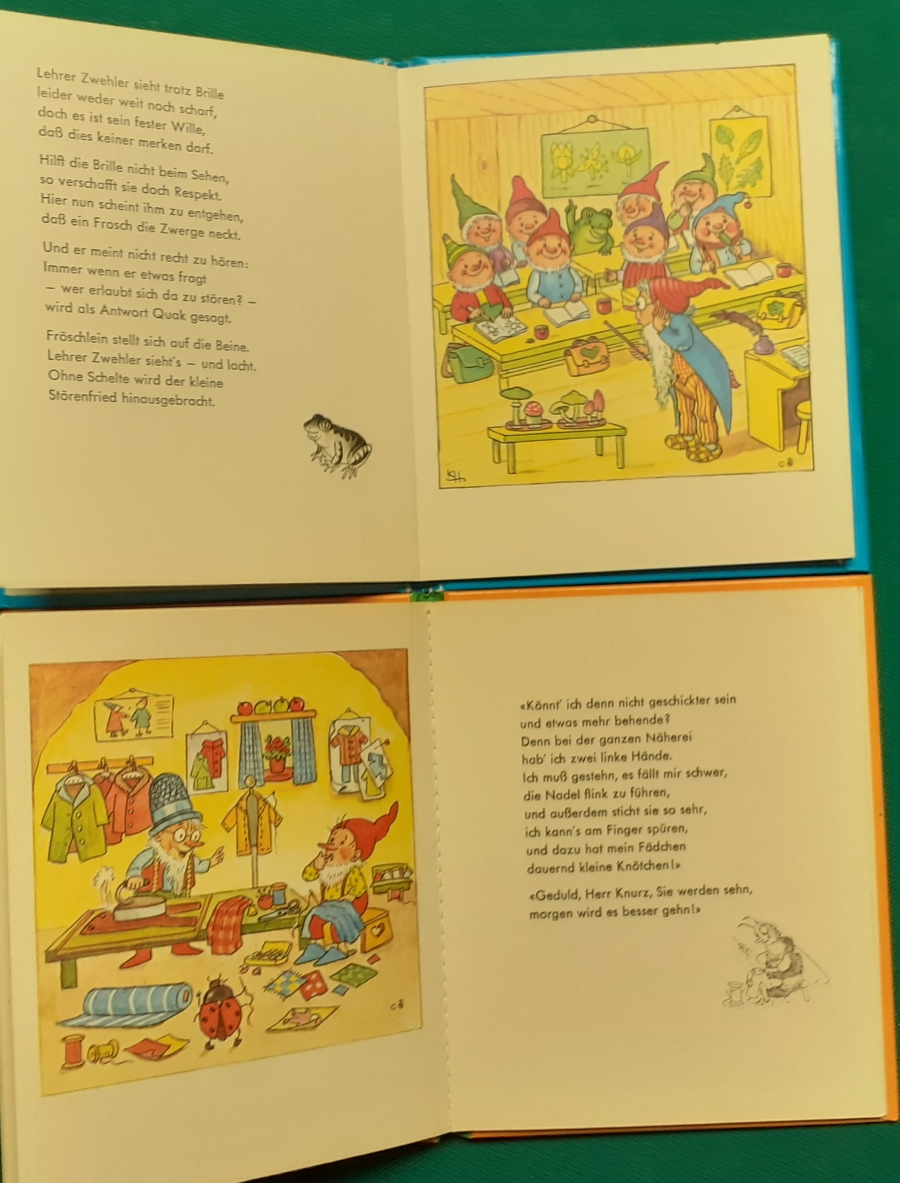 | Bilder von Katrin Höngesberg; Text von Hanns Trenkenbolz | Die Zwergenschule | Ausgabe von 1978; ca. 20 Seiten in normaler moderner Druckschrift - nicht paginiert; fester rundum lackierter Hartpappeinband; sehr guter altersgemäßer Zustand | 5 |