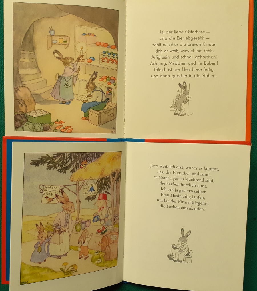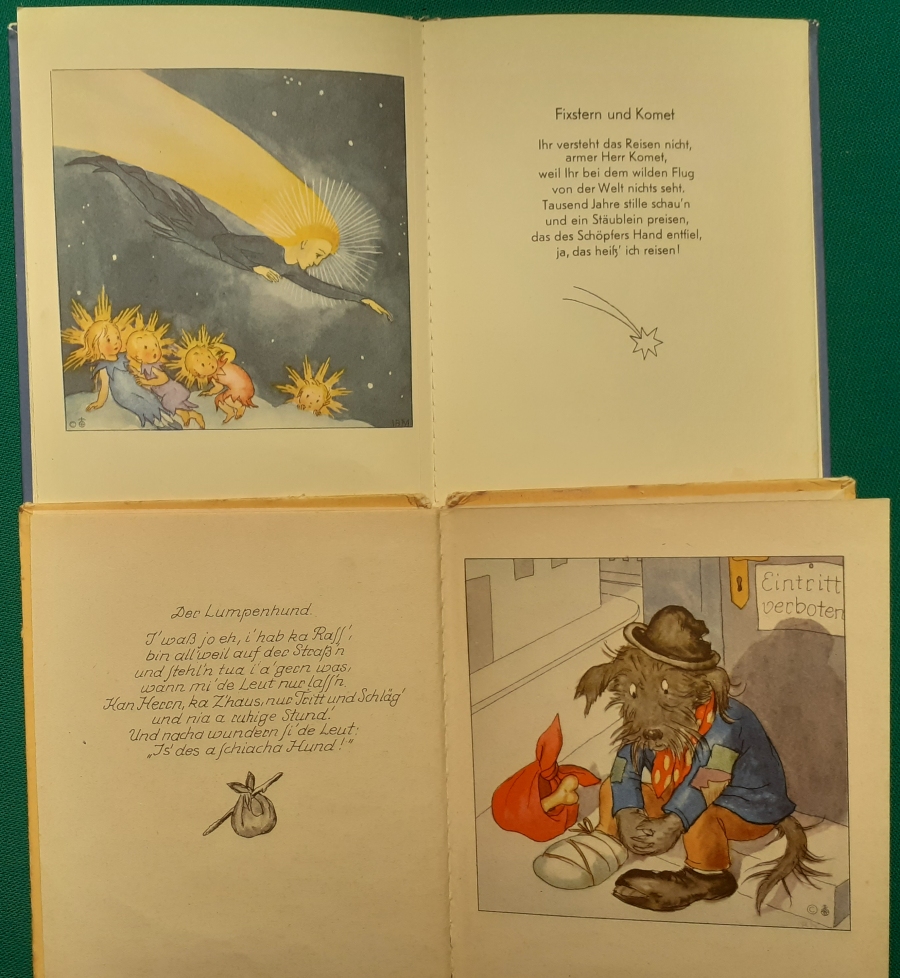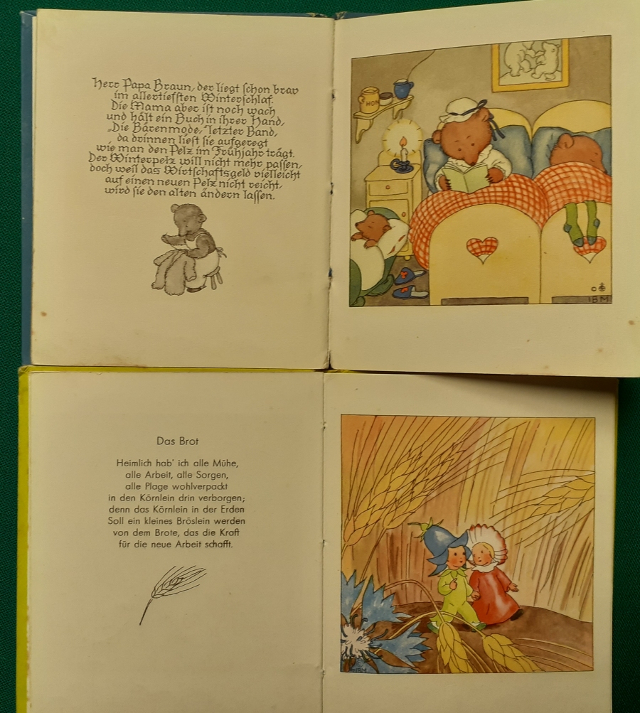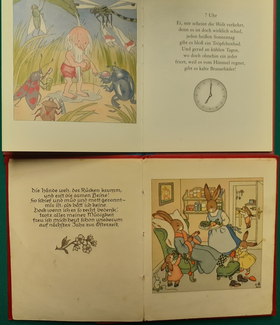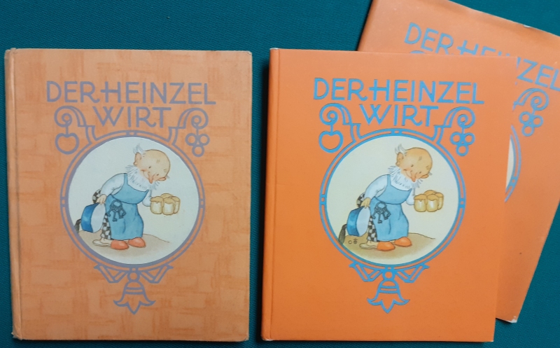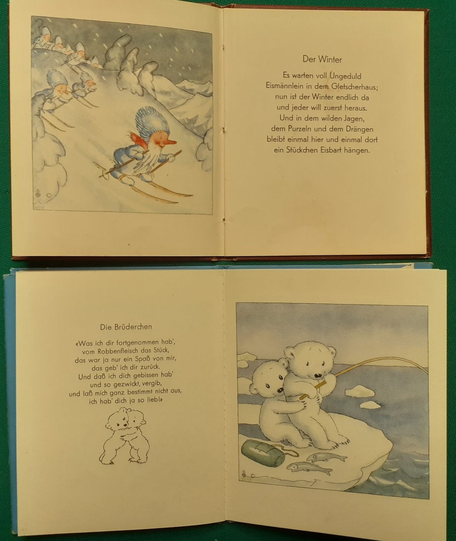 Abbildung links unten: Ausgabe um 1950; ca. 20 Seiten in normaler Druckschrift - nicht paginiert; mit noch farbenprächtigen Bildern; in mattem festen Hartpappeinband; Buchblock im Gelenk etwas gelockert und im Vor- und Nachsatz innen mit Tesafilm stabilisiert; an den Buchkanten bestoßen; innen z. T. gelbfleckig; insgesamt befriedigender altersgemäßer Zustand |