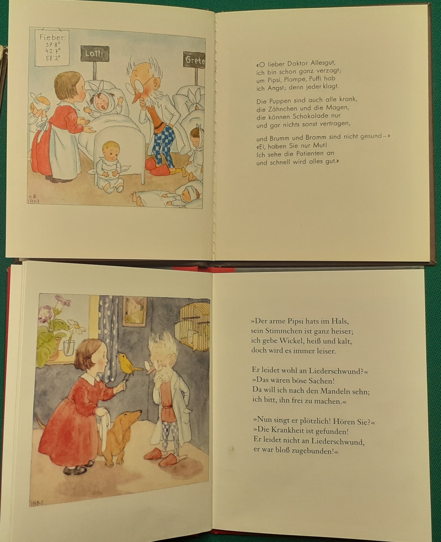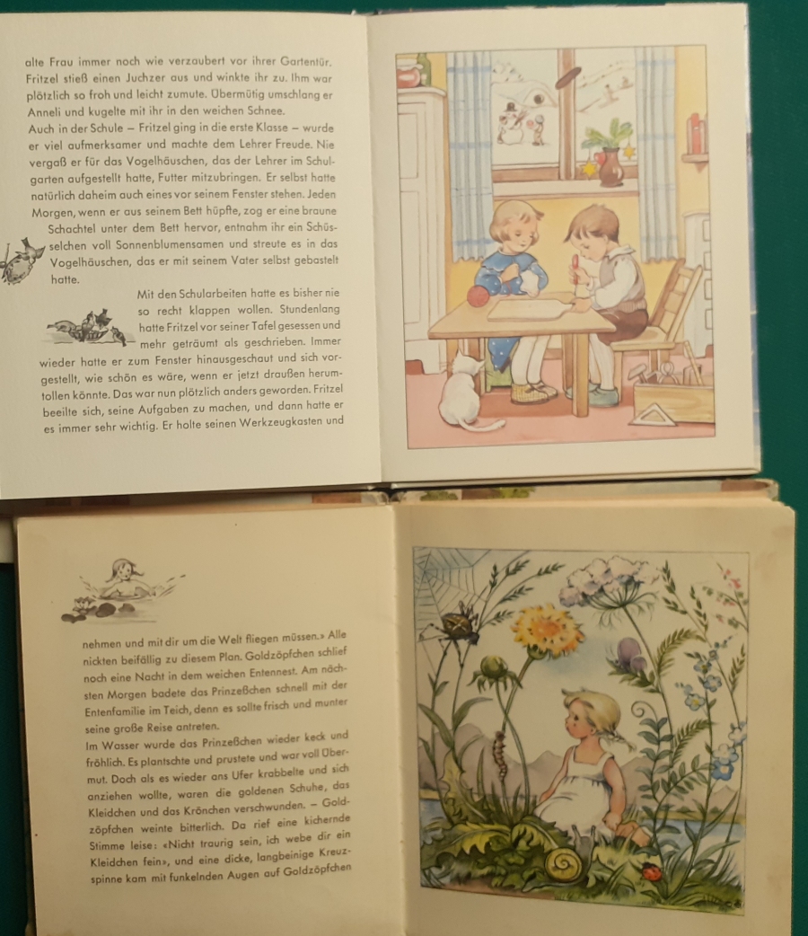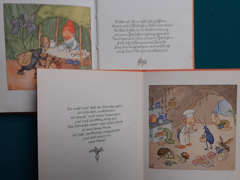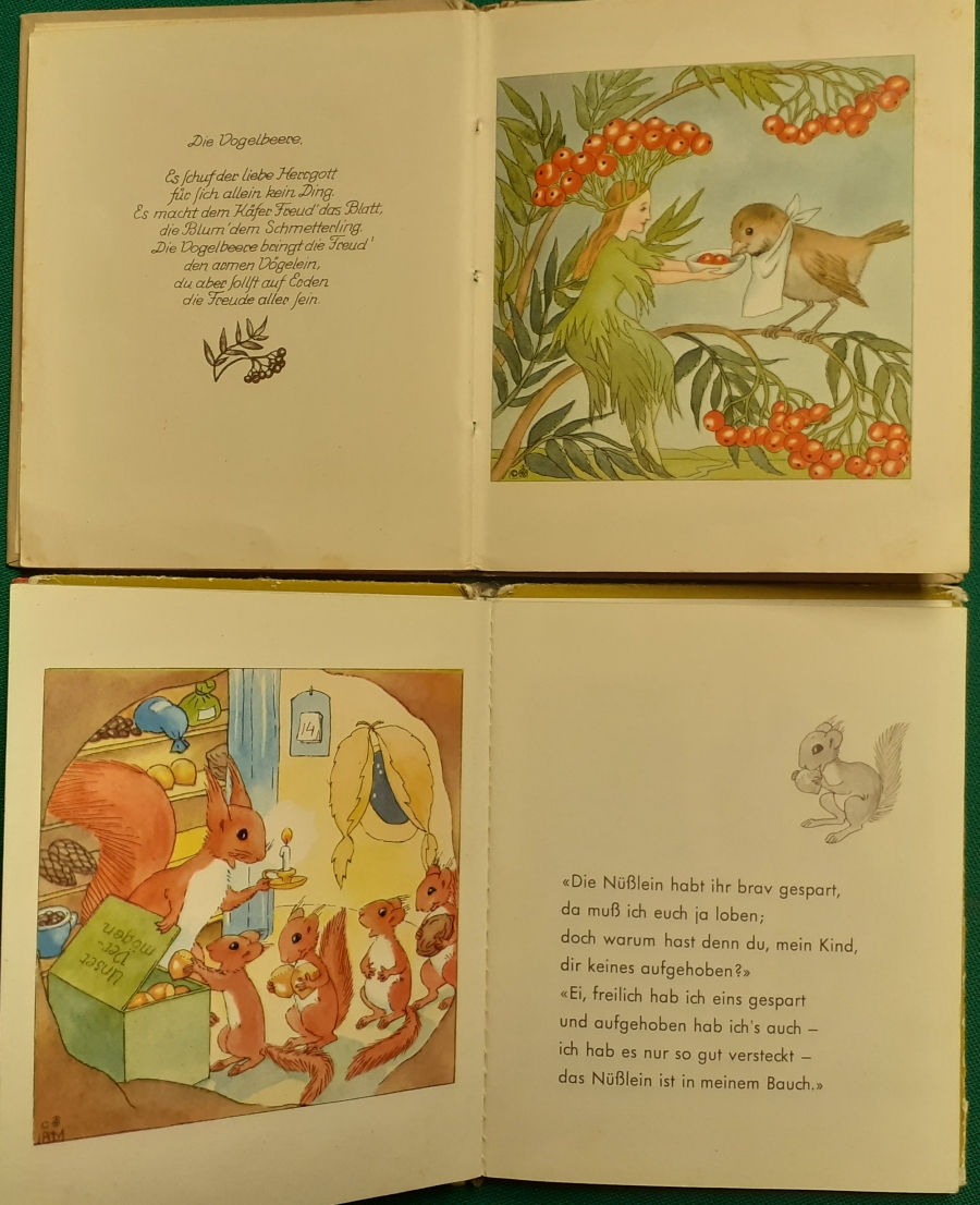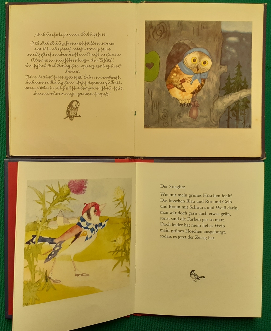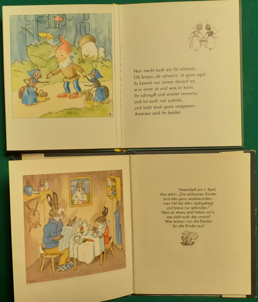 Abbildung links unten: Ausgabe um 1950; ca. 20 Seiten in normaler Druckschrift - nicht paginiert; mit noch farbenprächtigen Bildern; in mattem festen Hartpappeinband; Buchblock im Gelenk etwas gelockert und im Vor- und Nachsatz innen mit Tesafilm stabilisiert; an den Buchkanten bestoßen; innen z. T. gelbfleckig; insgesamt befriedigender altersgemäßer Zustand |