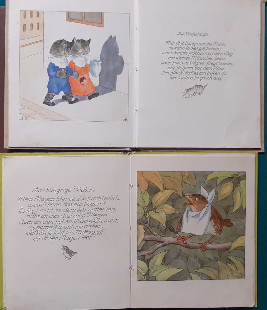 | Mäuschensorgen | Erstausgabe von 1934; ca. 20 Seiten in Sütterlinschrift - nicht paginiert; mit noch farbenprächtigen Bildern; in mattem festen Hartpappeinband; Buchblock im Gelenk etwas gelockert und im Vor- und Nachsatz innen leider nicht fachmännisch mit Tesafilm stabilisiert; insgesamt gepflegt und noch recht guter altersgemäßer Zustand | 10 |