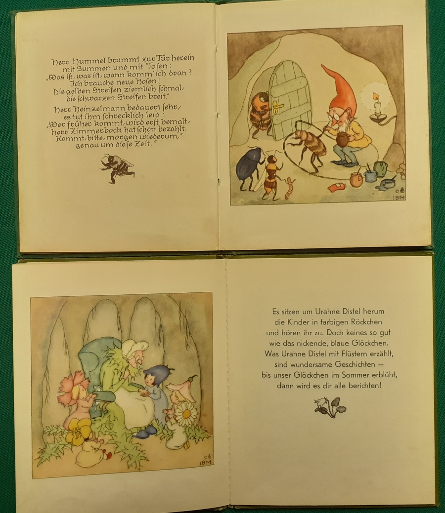 Abbildung oben: Erstausgabe von 1935; ca. 20 Seiten in normaler Druckschrift - nicht paginiert; Bilder noch sehr farbenprächtig; fester matter Hartpappeinband; Buchblock im Gelenk etwas gelockert und im Vor- und Nachsatz innen leider etwas unbeholfen mit Tesafilm stabilisiert; innen z. T. gelbfleckig; an den Buchkanten leicht bestoßen; insgesamt gepflegt und noch recht guter altersgemäßer Zustand |