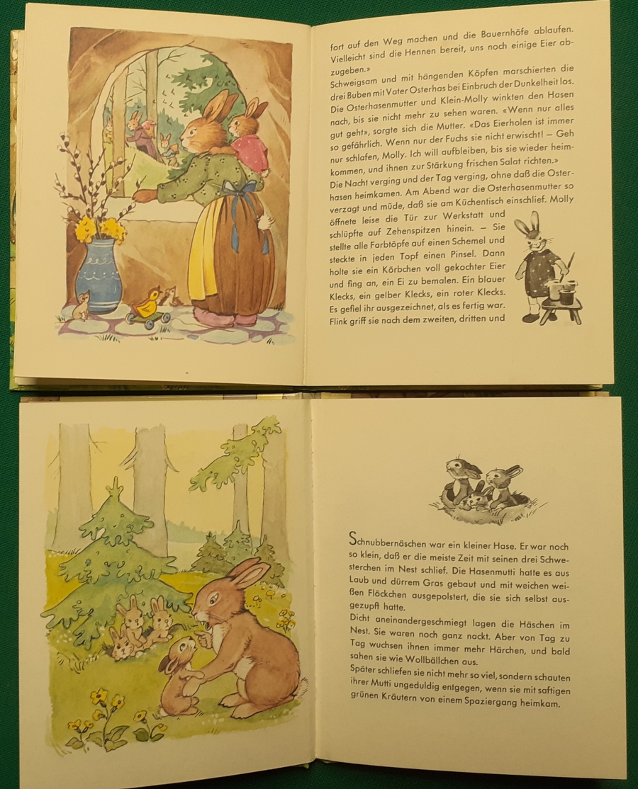 | Ilse Schmid | Molly, das Hasenkind | Ausgabe um 1980; ca. 20 Seiten in normaler moderner Druckschrift - nicht paginiert; fester rundum lackierter Hartpappeinband; guter altersgemäßer Zustand | 5 |