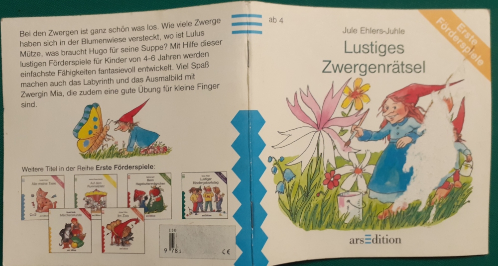 | Jule Ehlers-Juhle | Lustige Zwergenrätsel | Ausgabe von 1998; vorderer Einband berieben und Oberfläche etwas beschädigt; innen natürlich nicht benutzt und recht guter altersgemäßer Zustand | 1,50 |