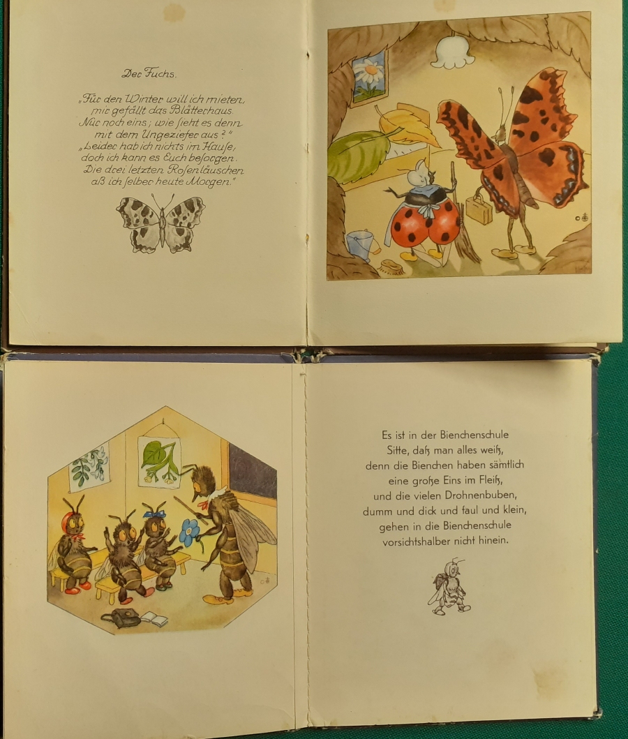 Abbildung links oben: Erstausgabe von 1940; ca. 20 Seiten in normaler Druckschrift - nicht paginiert; Bilder noch sehr farbenprächtig; fester matter Hartpappeinband; Buchblock im Gelenk etwas gelockert und im Vor- und Nachsatz innen schonend mit Tesafilm stabilisiert; leicht fleckig; an den Buchkanten bestoßen; insgesamt gepflegt und guter altersgemäßer Zustand |