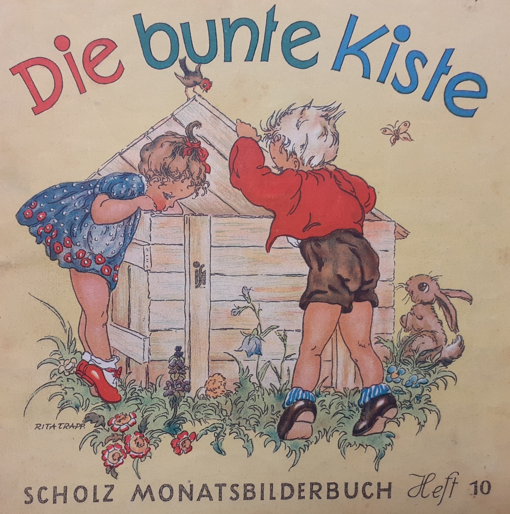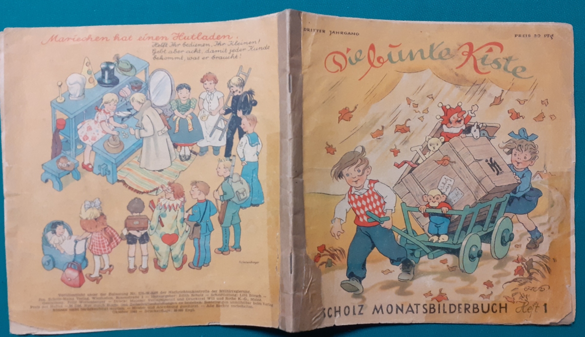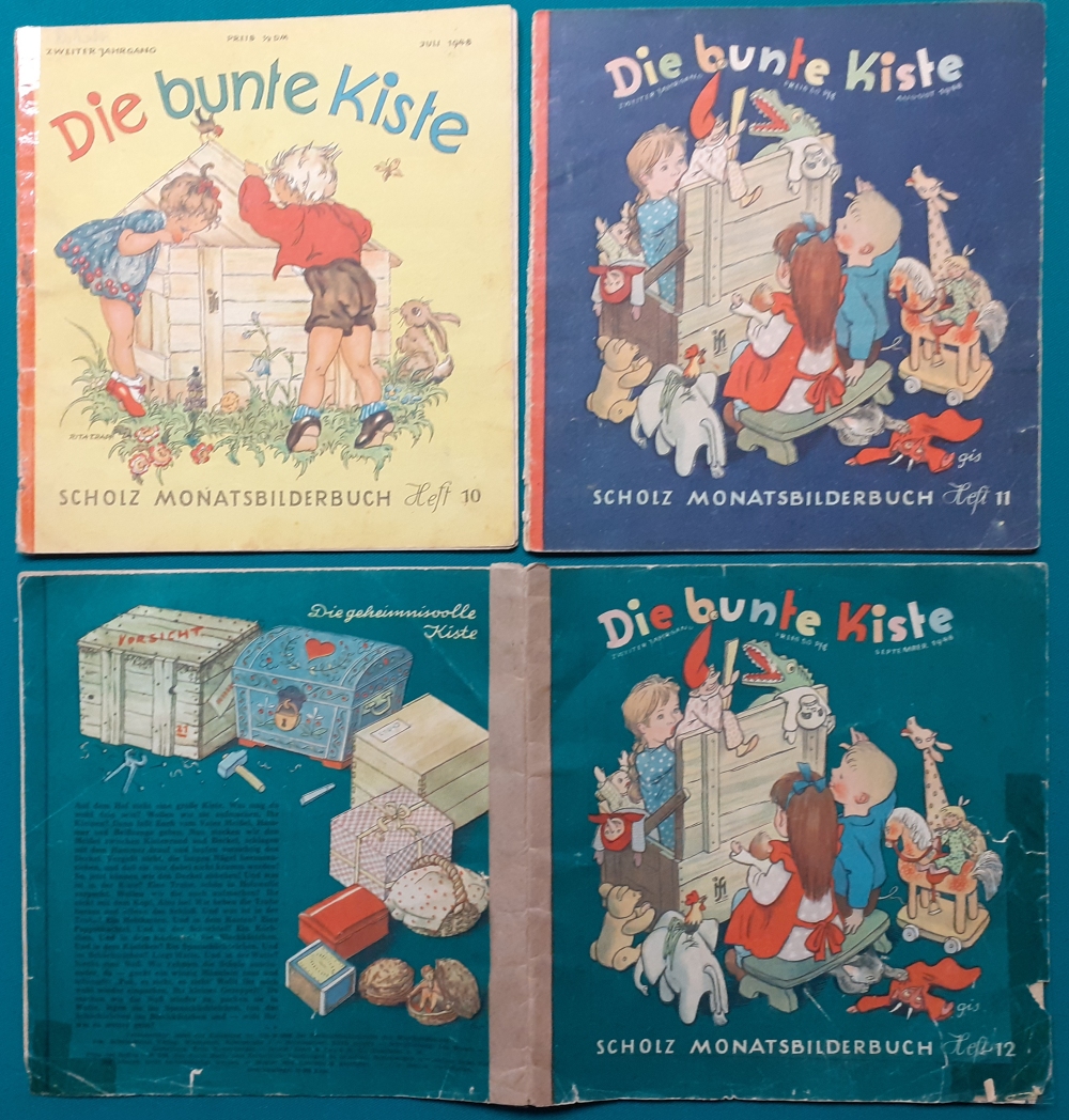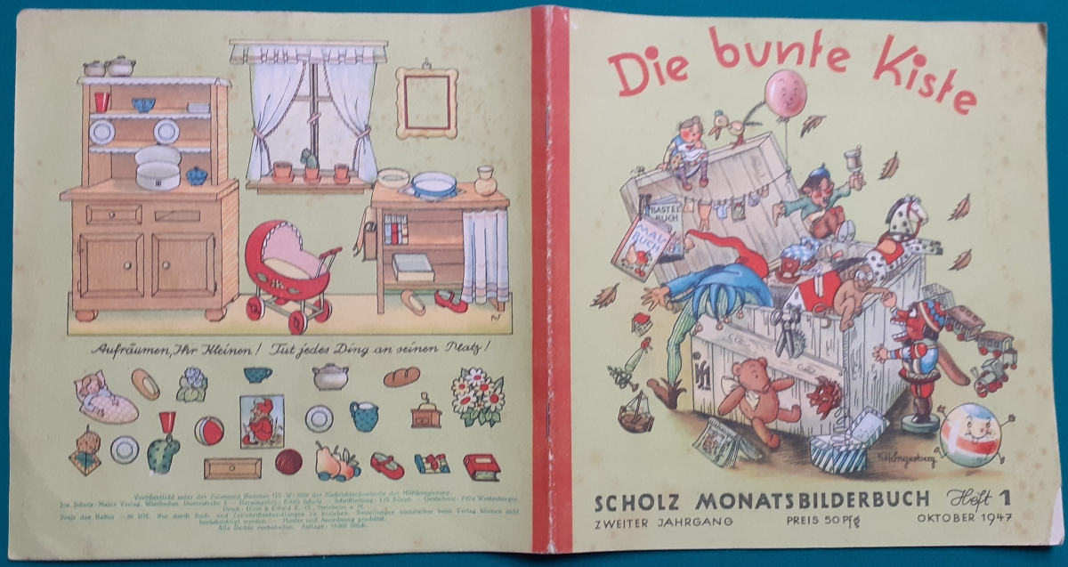 Es handelt sich um eine ab 1946 erschienene Reihe von bunten Bilderbüchern im Jos. Scholz-Mainz Verlag, Wiesbaden. Umfang der Hefte 12 Seiten. Papierumschlag, zweimal geheftet. Verkaufspreis 50 Pf. Auffällig an der Reihe ist die wunderbare kindgerechte graphische Gestaltung des Heftes von Fritz Westenberger und anderen bedeutenden Künstlern. Das Format war jeweils 20 x 20 cm; Adressaten waren Kinder meist im Vorschulalter. Das Heft enthält jeweils Rätsel; Basteltipps, Gedichte, kleine Geschichten und Lieder; zum Teil mit zweifarbigen, zum Teil mit sehr schönen bunt illustrierten Abbildungen diverser hochkarätiger Künstler. Anfangs erschienen die Bände unter alliierter Nachrichtenkontrolle der US-Militärregierung. Die Hefte sind nach den Jahrgängen sortiert. |