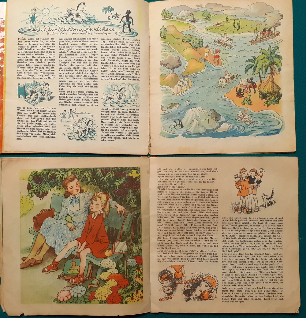 Thea Zimmermann - Bilder von Fritz Baumgarten: Das goldene Ei; Clara Lehn - Bilder von Fritz Westenberger: Das Wellenpferdchen; Lied der Purzel; Liselotte Burger - Zeichnung von K. Hängesberg: Schnecke und Eidechsen; Karin von Merhart-Wallin - Bilder von Martha Bertina: Dieter und Birgit an der Nordsee | an den Heftkanten bestoßen; Heftung war defekt: im Gelenk schonend mit Tesafilm stabilisiert; innen sauber und gepflegt und insgesamt noch in befriedigendem altersgemäßen Zustand | 6 |