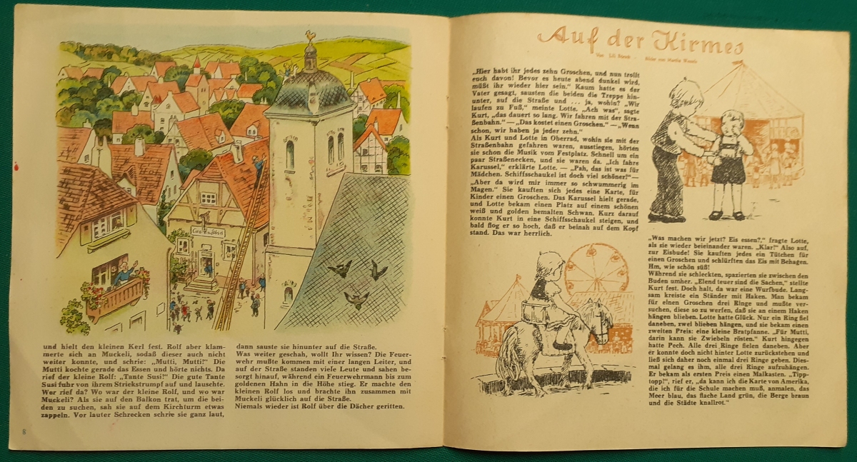 Vom Korn zum Brot mit sehr schönen Zeichnungen von Katrin Höngesberg; Kater Muckeli v. Edeltraut Ricke mit Illustrationen von Fritz Baumgarten; Auf der Kirmes von Lili Börsch mit Bildern von Martha Wessels ... | an den Heftkanten etwas bestoßen; innen sauber und gepflegt; Einband fleckig; insgesamt noch in gutem altersgemäßen Zustand | 8 |