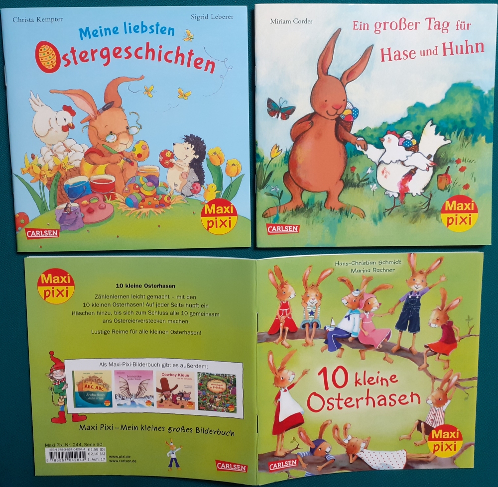 | Maxi-Pixi-Bücher aus dem Carlsen Verlag, Hamburg sind 15,7 x 15,7 cm groß und haben immer 24 Seiten. Die Bilderbücher im Softcover bieten Leseförderung, viel Spaß und eignen sich für alle Kinder, die gerne Bilder angucken und sich vorlesen lassen. | |