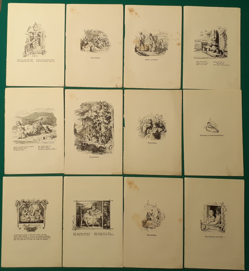 Weitere Bildermappe des Georg Wigand Verlages, Leipzig; Hrsg. W. Günther; erschienen um 1910; Formate der Mappen: 23 x 15 cm; Einbanddeckel aus Pappe: Bildersammlung von 12 Bildern von Ludwig Richter aus verschiedenen Mappen der Hefte aus dem Wigand Verlag, Leipzig (siehe oben); Format jeweils 23 x 15 cm; z.T. etwas gelbfleckig; ansonsten ok. und insgesamt in befriedigendem altersgemäßen Zustand Preis der 12 Bilder: 2 EURO |