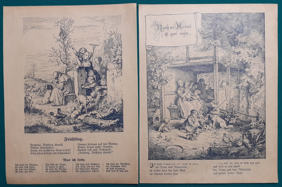 von aus dem Buch "Goldene Kinderzeit" im Hirsch Verlag, Konstanz; Ausgabe um 1890; Format 24 x 18 incl. Rand und Text; Papier nachgegilbt; Rückseiten mit Text und Bildern; insgesamt gepflegt und recht guter altersgemäßer Zustand Preis der beiden Bilder: 2 EURO |