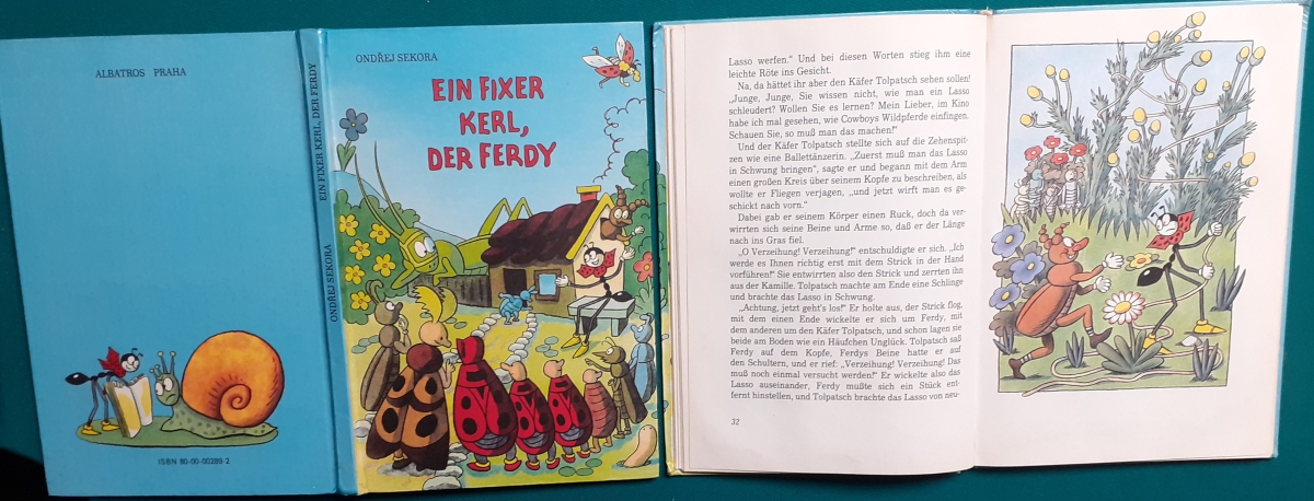 Ein fixer Kerl, der Ferdy Erstausgabe von 1966, Albatros Verlag Prag; mit wunderschönen Abbildungen; 80 Seiten!!; sehr stabiler rundum lackierter Hartpappeinband im Format 24,5 x 17 cm; leicht an den Buchkanten bestoßen; innen sauber und gepflegt und insgesamt sehr guter altersgemäßer Zustand Preis: 19 EURO |