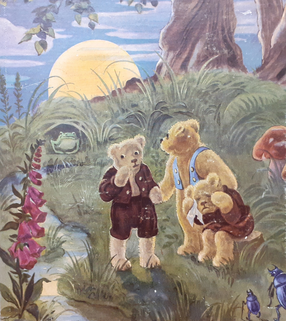 Neuauflagen der Teddy-Reihe: Teddy und Teddinchen Bilder von Anny Hoffmann; B & B Bücher, Hollabrunn; Ausgabe um 1995, ca. 30 bunte Seiten - nicht paginiert; rundum glanzlackierter sehr fester Hardcover Einband im Format 16 x 20 cm; Fadenbindung war im Gelenk etwas gelockert und wurde vorn innen am Vorsatz mit Tesafilm stabilisiert; insgesamt noch recht guter altersgemäßer Zustand; Preis: 5 EUR Hier zur Illustratoren-Galerie mit typischen Arbeiten von Anny Hoffmann |