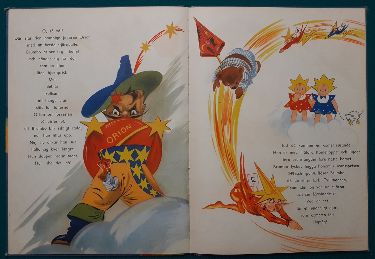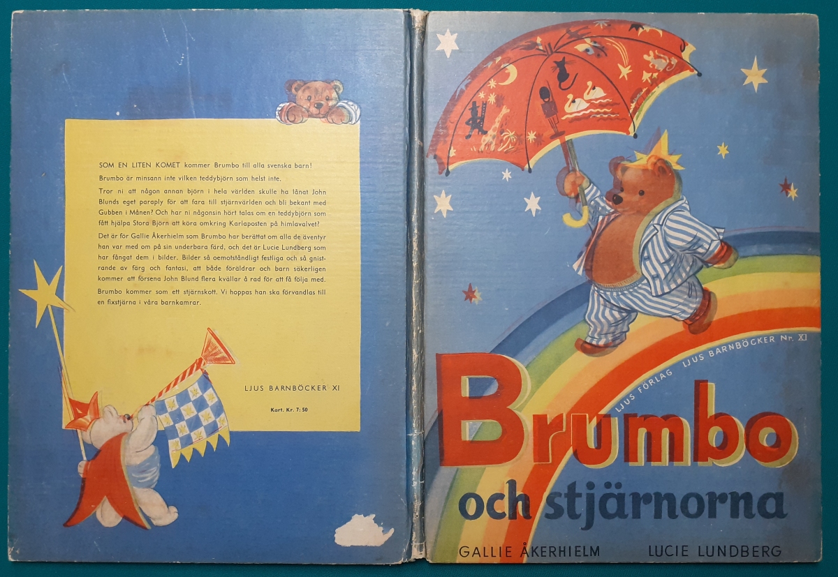 Brumbo och stjärnorna Ljus Verlag, Stockholm u.a.; Erstausgabe von 1947, ca. 30 Seiten in schwedischer Sprache - nicht paginiert - mit wunderschönen durchgehend farbigen Bildern von Lucie Lundberg und dem Text von Gallie Akerhielm; stabiler hochwertig gemachter fester Hartpappeinband im Maxiformat 35 x 26 cm, etwas an den Buchkanten bestoßen; Einband etwas fleckig; insgesamt gepflegt; alles gut lesbar und auch noch sehr schöne Farben; insgesamt sehr guter altersgemäßer Zustand; Preis: 19 EUR Hier zur Illustratoren-Galerie mit typischen Arbeiten von Lucie Lundberg |