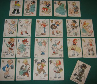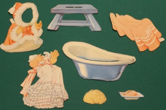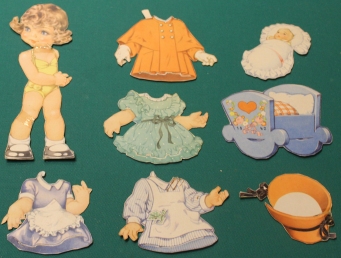 Ankleidepuppe Ausgabe um 1950, insgesamt 7 Hartkartonteile: der Figur Baby. Die Teile sind recht gut erhalten, haben Schlitze und Laschen, aber auch einige Knicke. Insgesamt recht guter altersgemäßer Zustand Preis: 5 EURO |