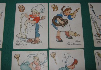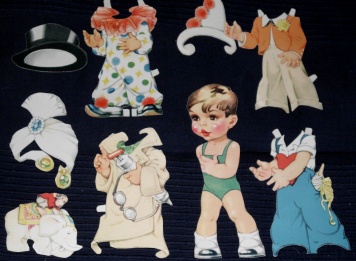 Ankleidepuppe Ausgabe um 1950, insgesamt 9 Hartkartonteile: die Figur Dieter der Länge 20 cm mit zugehörigen 8 Teilen: 3 Kopfbedeckungen, 4 Kleidungsstücke und ein Spielzeug. Die Teile sind recht gut erhalten, haben wohl die meisten Laschen, aber auch einige Knicke. Insgesamt recht guter altersgemäßer Zustand Preis: 9 EURO |