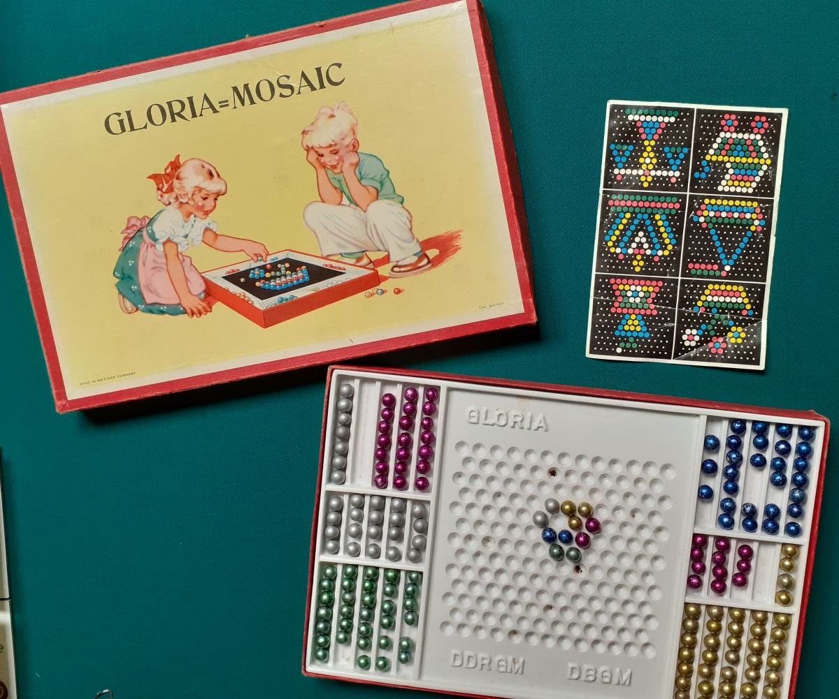Hersteller: Gloria (Deutschland) um 1950; mit dem wunderschönen Motiv von Ilse Wende-Lungershausen; Karton im Format 29 x 19 x 3 cm; Karton an den Kanten bestoßen und Deckel etwas beschädigt; mit 6 verschiedenen Vorlagen auf einem Extrablatt; Kugeln in 5 verschiedenen Farben; Spiel bespielt, aber gepflegt, Kunststoff-Innenteil ok.; Vorlagenblatt auf der Rückseite von Kinderhand bekritzelt; insgesamt guter altersgemäßer Zustand Preis: 16 EURO |