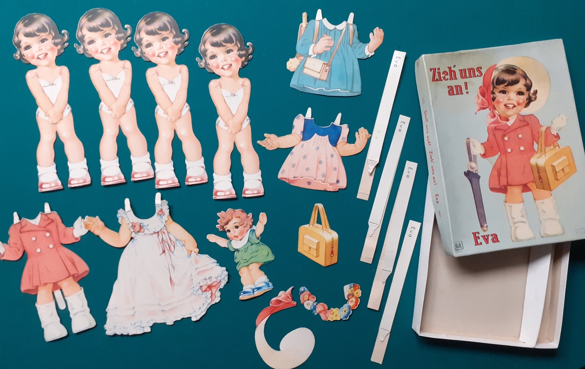 Zieh´ uns an'! Ausgabe um 1950, S & S Kinderbuchverlag; Art.-Nr. 7011; insgesamt 12 Hartkartonteile im Originalkarton: der Figur Eva; dazu vier Namensschilder "Eva" (zum Anstecken). Die Teile sind recht gut erhalten, haben Schlitze und Laschen, aber auch einige Knicke und sind natürlich normal bespielt. Der Karton ist in sich verzogen und fleckig, aber ok.; insgesamt recht guter altersgemäßer Zustand Preis: 29 EURO |