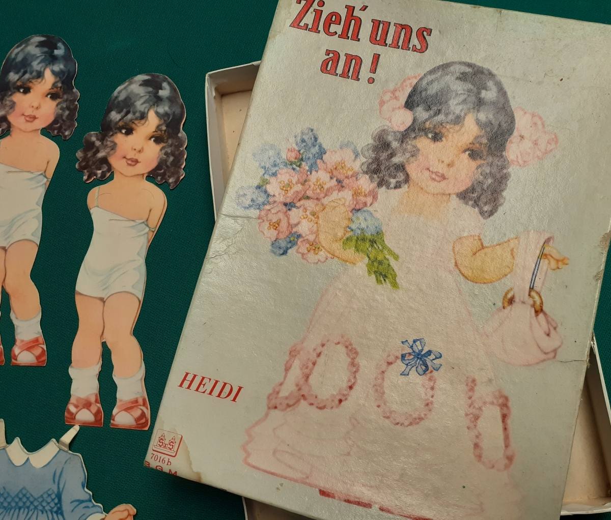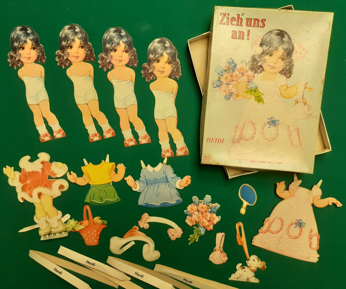 Zieh´ uns an'! Ausgabe um 1950, S & S Kinderbuchverlag; Art.-Nr. 7016b; insgesamt 15 Hartkartonteile im Originalkarton: der Figur Heidi; dazu vier Namensschilder "Heidi" (zum Anstecken). Die Teile sind recht gut erhalten, haben Schlitze und Laschen, aber auch einige Knicke und sind natürlich normal bespielt. Der Karton ist in sich verzogen und fleckig, aber ok.; insgesamt recht guter altersgemäßer Zustand Preis: 29 EURO |
