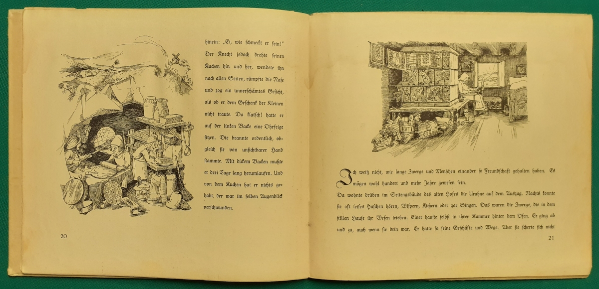 Das Zwergenbuch Illustriert von Friedrich Bochmann, erzählt von Rudolf Kreßner; Hegel & Schade, Leipzig, Ausgabe um 1940, 32 Seiten, Leinenrücken mit festem Hartpappeinband im Querformat 21,5 x 24 cm; voller wunderbarer Schwarz-Weiß-Abbildungen; hinterer Einband fleckig; Heftbindung innen am Gelenk war labil und wurde schonend innen mit Klebeband stabilisiert; Bindung sonst ok. und alle Blätter fest; insgesamt befriedigender altersgemäßer Zustand, Preis: 7 EUR Friedrich Bochmann wurde am 28.09.1906 in Plauen geboren. Er studierte 1928 – 1933 Studium an der Kunstakademie in Dresden bei G. Lührig, seit 1928 dann bei Otto Dix (Ott-Dix-Schüler). Ab 1929 Einzelatellier an der Kunstakademie. Später Tätigkeit als Illustrator u.a. von Kinderbüchern. Er verstarb 1982 in Karlsruhe. |