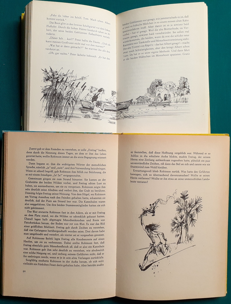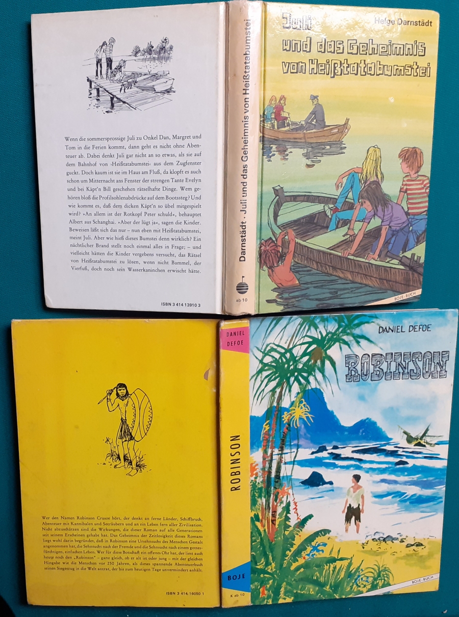 Boje-Jugendbücher Helge Darnstädt: Juli und das Geheimnis von Heißtatabumstei Erstausgabe von 1973, Illustrationen von Ulrik Schramm, 140 Seiten, guter altersgemäßer Zustand, Preis: 6 EUR Hier zur Illustratoren-Galerie mit typischen Arbeiten von Ulrik Schramm siehe hier weitere Bücher von Helge Darnstädt ... Daniel Defoe: Robinson Illustrationen von Kurt Schmischke, Ausgabe von 1972, 184 Seiten, guter altersgemäßer Zustand, Preis: 6 EUR Hier zur Illustratoren-Galerie mit typischen Arbeiten von Kurt Schmischke Eine große Zahl von Robinson - Varianten siehe unter: Robinson - Variationen ... |