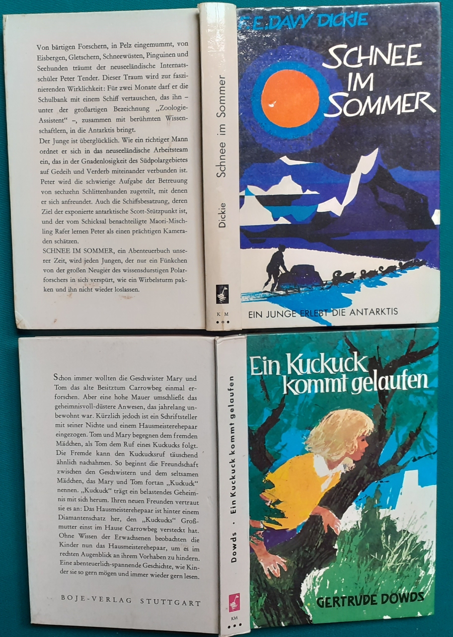 Boje-Jugendbücher F. E. Davy Dickie: Schnee im Sommer Ein Junge erlebt die Antarktis Erstausgabe von 1970, 176 Seiten, Illustrationen von Erich Hölle, guter altersgemäßer Zustand, Preis: 6 EUR Hier zur Illustratoren-Galerie mit typischen Arbeiten von Erich Hölle Gertrude Dowds: Gertrude Emma (Trudi) Dowds (geb. am 12. Oktober 1921 in Beverly Hills; gest. am 18.12.2003 in Long Beach), US-amerikanische Schriftstellerin Ein Kuckuck kommt gelaufen Erstausgabe von 1964, 160 Seiten, Illustrationen von Erich Hölle, sehr guter altersgemäßer Zustand, Preis: 7 EUR Hier zur Illustratoren-Galerie mit typischen Arbeiten von Erich Hölle |