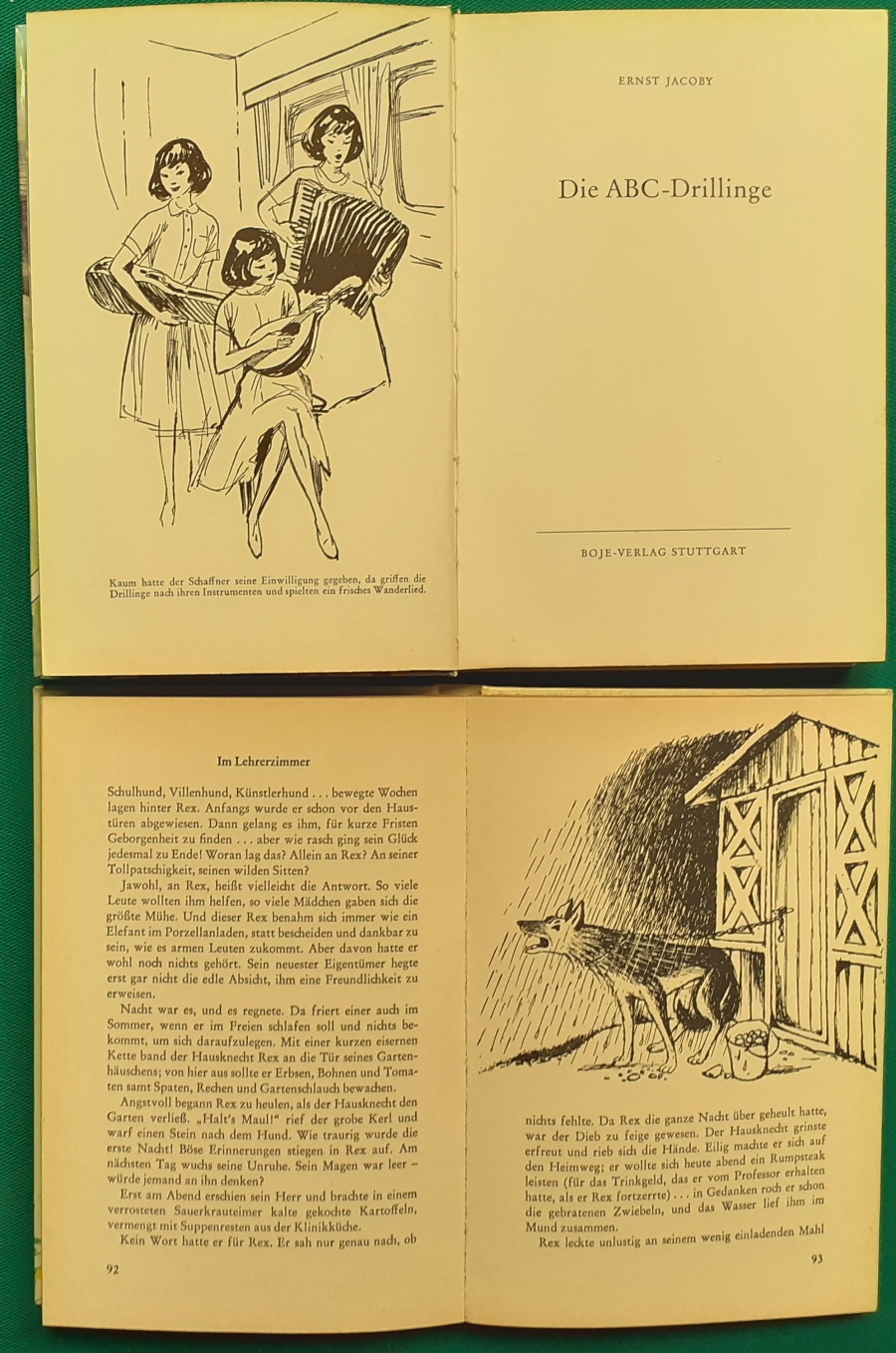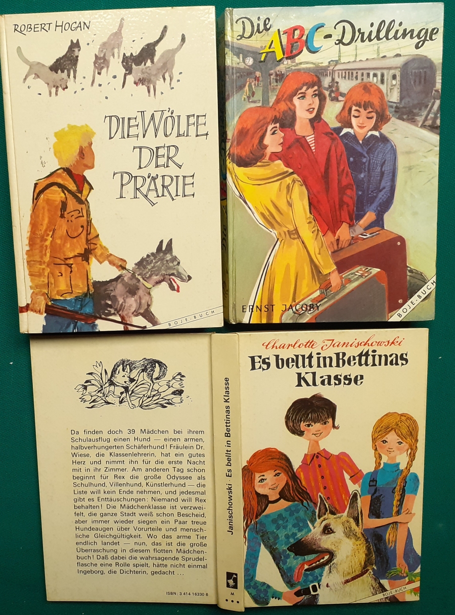 Boje-Jugendbücher Robert Hogan: Die Wölfe der Prärie Erstausgabe von 1960, 192 Seiten, Illustrationen von Kurt Schmischke und Walter Rieck, guter altersgemäßer Zustand, Preis: 6 EUR Hier zur Illustratoren-Galerie mit typischen Arbeiten von Kurt Schmischke Hier zur Illustratoren-Galerie mit typischen Arbeiten von Walter Rieck Ernst Jacoby: Die ABC-Drillinge Erstausgabe von 1958, Illustrationen von Inge Drexler; rundum lackierter fester Hartpappeinband; guter altersgemäßer Zustand; Preis: 7 EUR Inge Drexler (Geburtsname): Früherer Name: Inge Hansmann; letzter Name: Inge Auf dem Hövel; geb. 1910 in Zürich, gest. 2002; Schauspielerin, 1955 Theaterzeichnerin beim Münchner Merkur, ab 1958 bei der Süddeutschen Zeitung. Charlotte Janischowski: Es bellt in Bettinas Klasse Ausgabe von 1971, Illustrationen von Erika Meier-Albert; rundum lackierter fester Hartpappeinband; guter altersgemäßer Zustand; Preis: 5 EUR Hier zur Illustratoren-Galerie mit typischen Arbeiten von Erika Meier-Albert |
