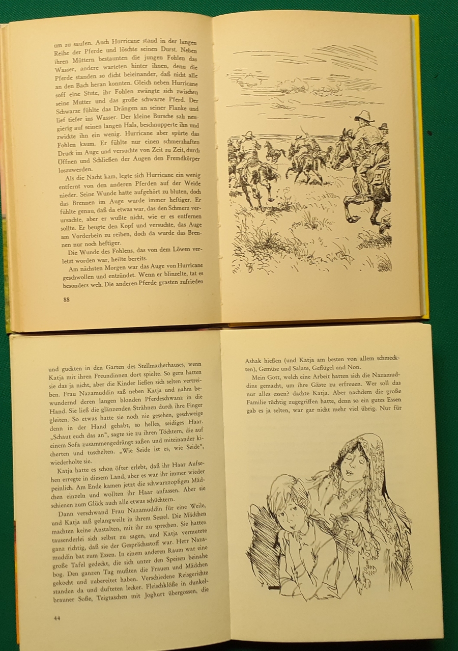 Boje-Jugendbücher Andrée Clair: Ein bisschen Glück durch Colette Erstausgabe von 1957, Illustrationen von Fidel Nebehosteny, 144 Seiten, guter altersgemäßer Zustand, Preis: 6 EUR Andrée Clair (geb. am 6. Mai 1916 in Frankreich; gest. 1982; eigentlich Renée Jung ) war eine französische Schriftstellerin. Clair schrieb zahlreiche Kinder- und Jugendbücher, von denen die meisten in Afrika spielen. Außerdem veröffentlicht sie Gedichte und Sachbücher über Afrika. Hier zur Illustratoren-Galerie mit typischen Arbeiten von Fidel Nebehosteny Lettice Cooper: Kissis kleiner Kater Erstausgabe von 1964, 126 Seiten, Illustrationen von Jutta Kirsch-Korn, Buch in gutem altersgemäßen Zustand Preis: 6 EUR Lettice Ulpha Cooper (geb. am 3. September 1897 in Eccles, Lancashire; gest. am 24. Juli 1994 in Coltishall, Norfolk) war eine englische Schriftstellerin. Jutta Kirsch-Korn, geboren 1931 in Ludwigshafen am Rhein, studierte Grafikdesign an der Krefelder Kunsthochschule und war anschließend in verschiedenen Werbeateliers tätig. Umfangreiche Tätigkeiten besonders für Kinderbuchverlage, vor allem Illustration und Buchdesign, als selbständige Buchautorin im Bereich Kinderbeschäftigung, Kinder- und Jugendsachbuch sowie für Kinder- und Jugendzeitschriften. Sie starb 2006 in Überlingen. |