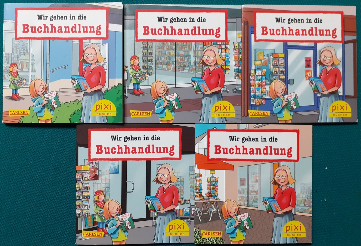 links ein Stand mit Büchern): Wir gehen in die Buchhandlung |