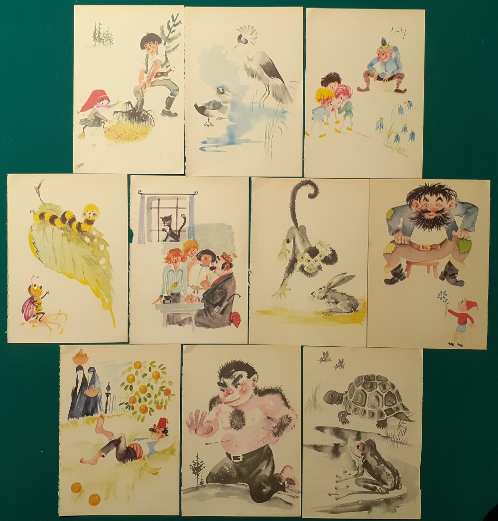 10 Bilder von aus dem Buch "Meine schönsten Märchen aus aller Welt", Lingen Verlag Köln; Ausgabe von 1969; es handelt sich um Innen-Illustrationen aus dem Buch; Seitenformat jeweils 23,5 x 16,5 cm incl. Passepartout; Rückseiten der Bilder mit Text; Schnittkanten am Gelenk jeweils etwas unsauber; sonst guter altersgemäßer Zustand Preis für die 10 Bilder komplett: 4 EURO |