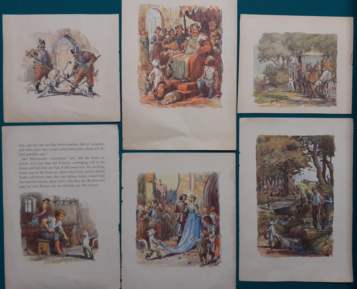 6 Bilder von Jeweils Innen-Illustrationen, entnommen aus dem Buch "Der gestiefelte Kater" Kinderbuchverlag, Berlin; Erstausgabe von 1955; Bilder in unterschiedlichem Format - die größten im Seitenformat 20 x 14 cm incl. Passepartout; Rückseiten mit Text; Kanten zum Gelenk vom Herausnehmen etwas ungleichmäßig; Bilder sonst in gutem altersgemäßen Zustand Komplettpreis der 6 Bilder: 3 EURO |