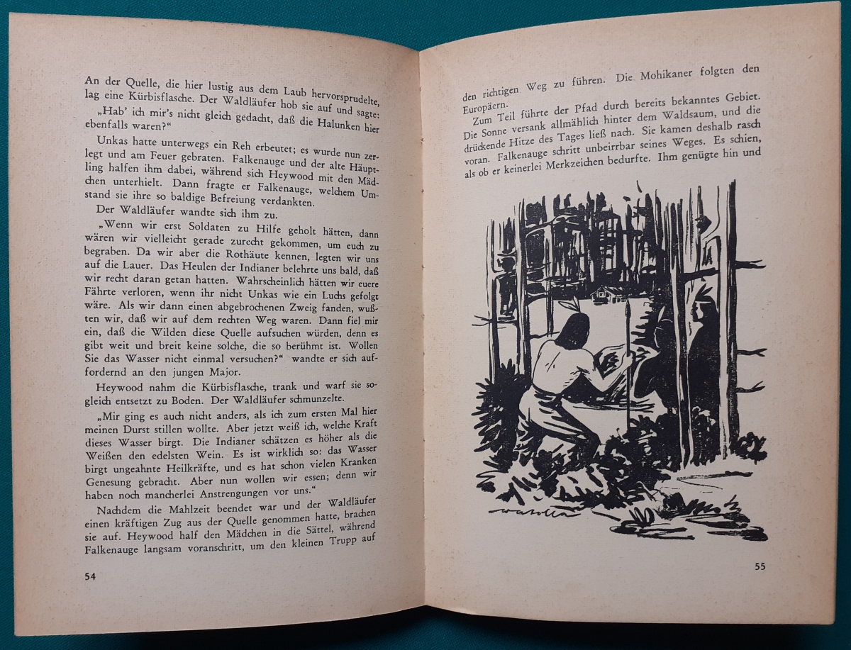 James Fenimore Cooper: Der letzte Mohikaner Bayerische Verlagsanstalt, Bamberg; Illustrationen von Richard Watolla, Ausgabe von 1951, 120 Seiten, Leinenrücken mit festem Hartpappeinband; etwas an den Buchkanten bestoßen; guter altersgemäßer Zustand, Preis: 6 EURO |