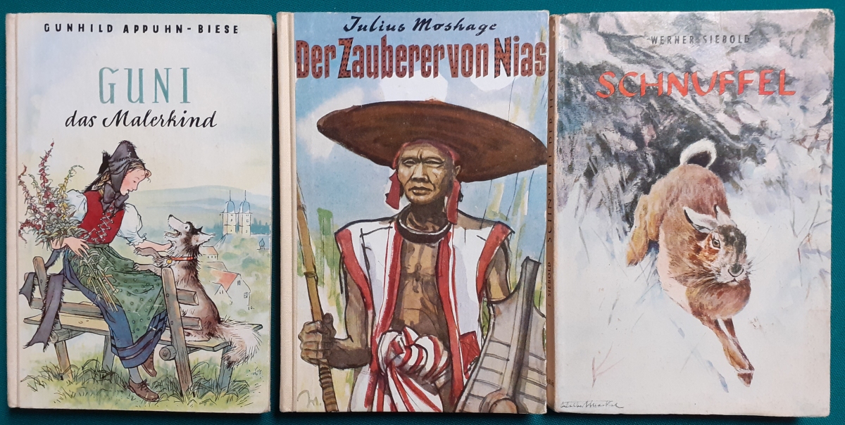 für kleine Kinder Die Bände erschienen ab 1950 bis in die 1960er Jahre im Format 18,5 x 12,5 cm und hatten die laufenden Bestellnummern ab 3001. Die Nummernbezeichnungen benutzte man bis ins Jahr 1959; danach verzichtete man auf die 3000er Bestellnummern, so dass wir bei einigen Bänden höherer Auflagen der 1960er Jahre keine ursprüngliche Nummer mehr haben. Diese Bände sind am Ende der folgenden Tabelle zusammengefasst. Die Bände der Reihe ab Ende der 1950er Jahre (sowie die höheren Auflagen der ersten Bände der Reihe) haben außerdem ein etwas vergrößertes Format mit 19,5 x 13,5 cm und auf dem hinteren hinteren Einband eine Reihenbezeichnung "Für kleine ABC-Schützen wie Dich" mit der Angabe einiger Bände der Reihe. |