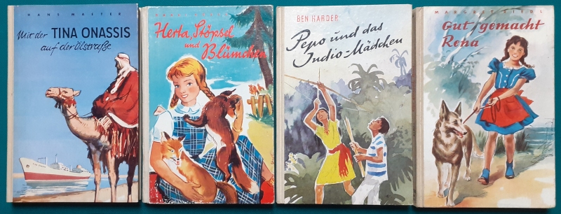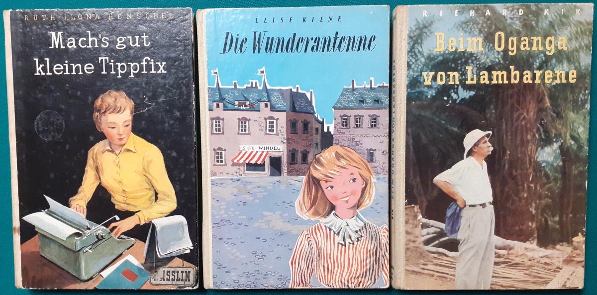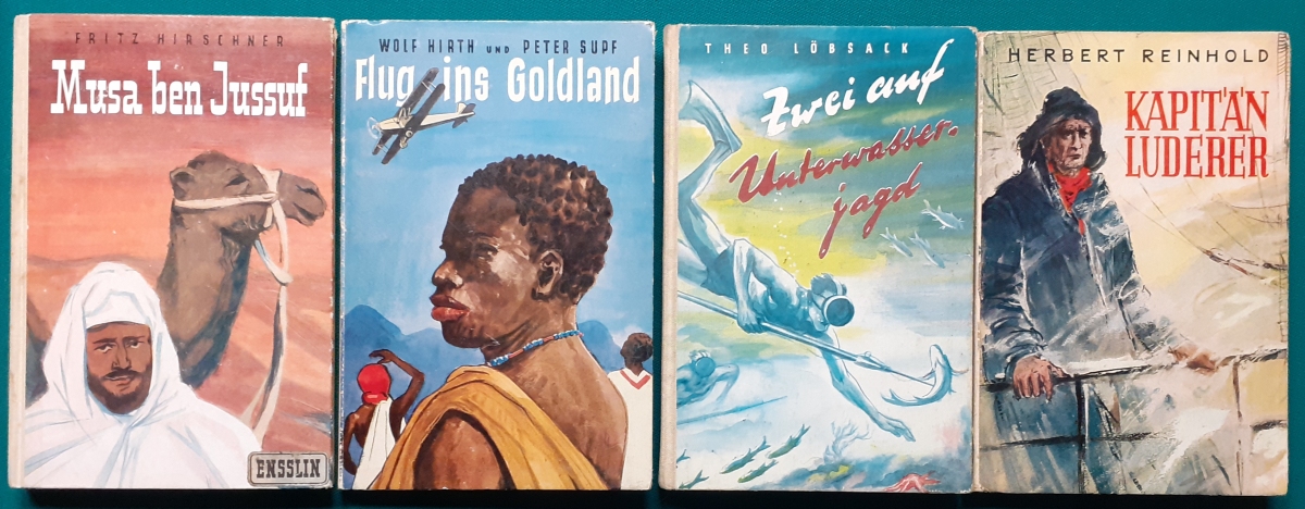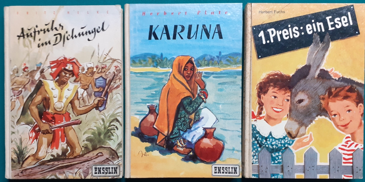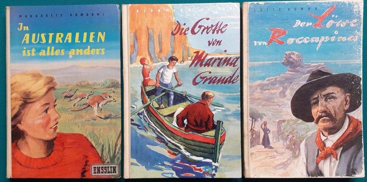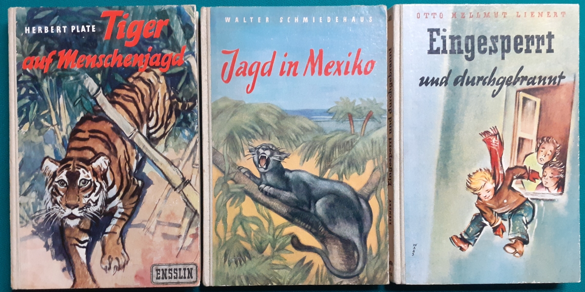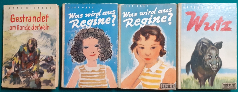 Ensslins große Jugendbücher mit Leinenrücken und festem lackierten Hartpappeinband im Format 21,5 x 15 cm; die Bände erschienen in den 1950er und Anfang der 1960er Jahre; sie hatten eine vierstellige Bestellnummer. Anmerkung: Diese Reihe ist nicht zu verwechseln mit den Voll-Leinen-Ausgaben in gleicher Größe, die in den 1960er Jahren erschienen. |