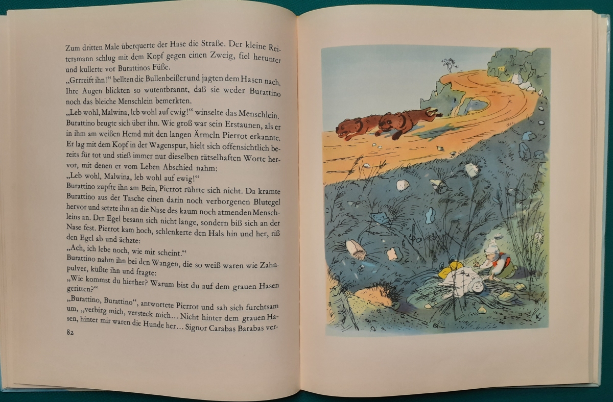 Das goldene Schlüsselchen Alfred Holz Verlag, Berlin, Ausgabe um 1965, wunderschöne Illustrationen von A. Kanewskij (Textillustrationen) und Albert-Georg Jahn (Einbandbild); 168 Seiten, hochwertige Verarbeitung mit Leinenrücken und festem lackierten Hartpappeinband im Maxi-Format 28,5 x 23 cm, sehr guter altersgemäßer Zustand Preis: 12 EUR
