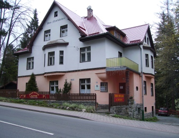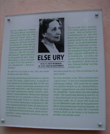 Dieses Haus in Karpac, Schlesien (Polen) am Fuße der Schneekoppe, kaufte Else Ury 1926 für ihre Familie als Feriensitz. Die Fotos stammen vom Mai 2008 (Privataufnahme: Heinsohn) und zeigen das Haus "Dom Nesthäkchen" (siehe Schriftzug oben auf der Vorderseite), das heute als Pension dient und sehr schön restauriert ist. Die Gedenktafel (in polnischer und deutscher Sprache) für Else Ury ist im Eingangsbereich vorn außen angebracht. Der Entwurf der Gedenktafel wurde 2004 und 2005 von zwei Hamburgern in Absprache mit den Eigentümern gestaltet. |