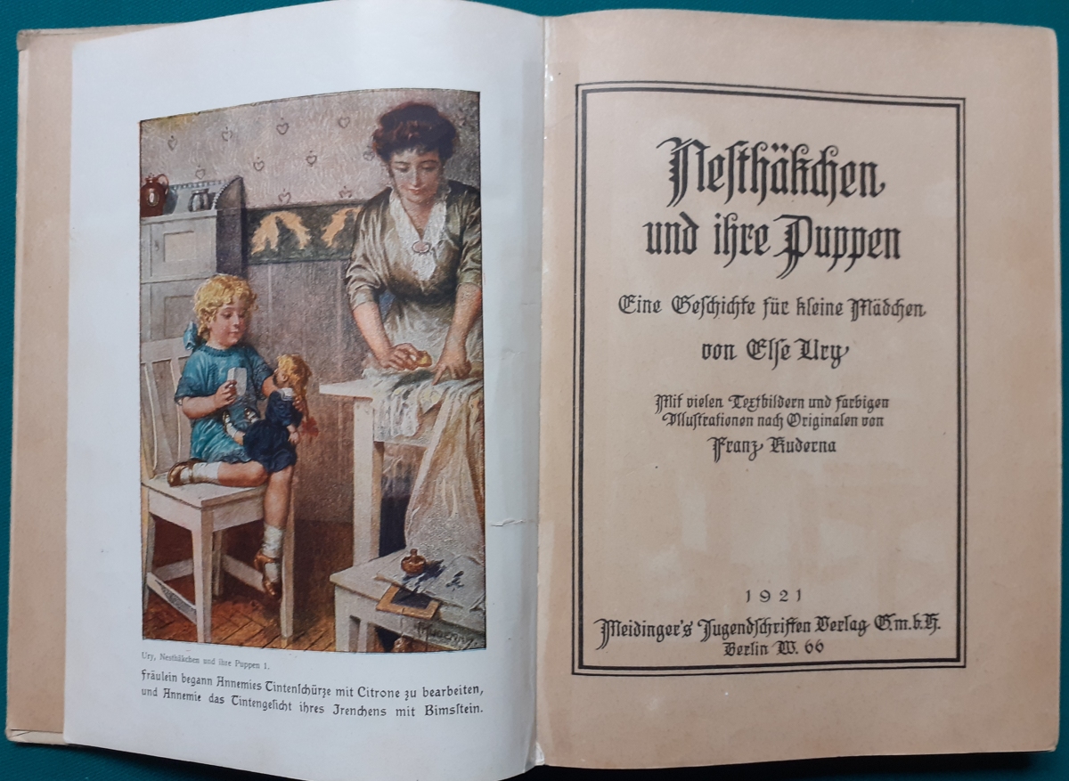 Nesthäkchen und ihre Puppen Erstausgabe von 1921!!!, 182 Seiten; Leinenrücken mit festem Hartpappeinband, mit Illustrationen von Franz Kuderna; Buchkanten etwas bestoßen, Buchblock war im Gelenk etwas gelockert und wurde schonend mit Klebeband im Vor- und Nachsatz innen stabilisiert; Bindung insgesamt recht labil - aber alle Blätter noch fest und insgesamt noch recht guter altersgemäßer Zustand Preis: 18 EURO |