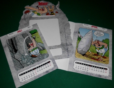 Asterix-Jahreskalender 2011 mit je einem Blatt pro Monat mit Asterix-Motiven aus den Abenteuerheften; Einsteckhalter aus Pappe zum Aufhängen oder Aufstellen; Format eines Kalenderblattes: 21 x 16 cm; neuwertig und nie benutzt Preis: 3 EUR |