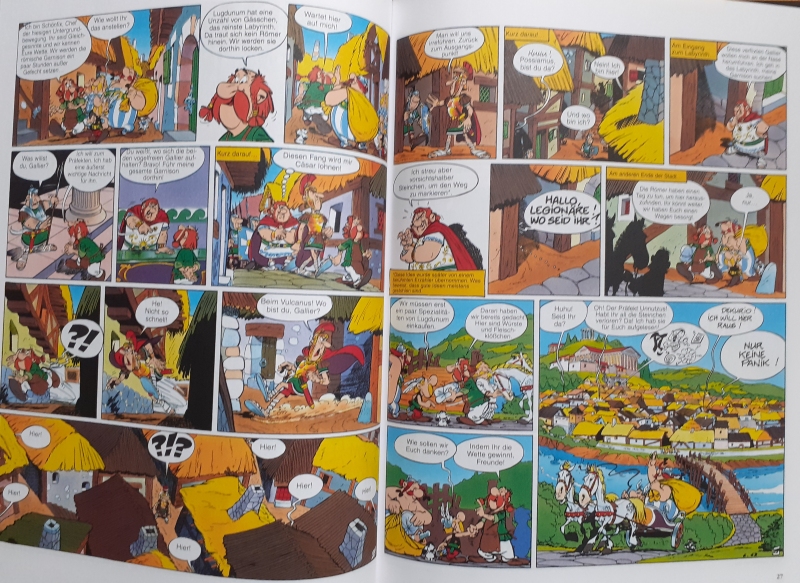 "Wir befinden uns im Jahre 50 v. Chr. Ganz Gallien ist von den Römern besetzt ... Ganz Gallien? Nein. Ein von unbeugsamen Galliern bevölkertes Dorf hört nicht auf, dem Eindringling Widerstand zu leisten. Und das Leben ist nicht leicht für die römischen Legionäre, die als Besatzung in den befestigten Lagern Babaorum, Aquarium, Laudanum und Kleinbonum liegen ..." So beginnen die Asterix-Bände. Das widerspenstische kleine Fischerdorf im liegt Nordwesten Galliens (der heutigen Bretagne) und berühmte Bewohner des Dorfes sind Asterix und Obelix, der Barde Troubadix, der Häuptling Majestix und der Druide Miraculix. Dieser braut einen Zaubertrank, der den Dorfbewohnern übermenschliche Kräfte verleiht, denen die römischen Armeen nicht gewachsen sind. Asterix ist eine französchische Comic-Serie. Die erste deutsche Asterix-Übersetzung erschien 1965/66 im Kauka-Verlag und unterschied sich noch sehr stark vom Original, da hier aus den gallischen Helden Germanen gemacht und das Dorf nach Germanien versetzt wurde, wo es den Namen Bonhalla (eine Mischung aus der ehemaligen Bundeshauptstadt Bonn und den Göttersitz der Germanen Walhalla) bekam. Es gab rechtliche Auseinandersetzungen bezüglich dieser Veröffentlichungen mit dem französischen Original. Ab 1968 erschienen die Geschichten, diesmal originalgetreu, in den MV-Comics des EHAPA-Verlags, der die Serie ab 1968 als Einzelalben herausbrachte, wobei die Bände 2 - 7 in Deutschland in veränderter Reihenfolge zu den französchischen Originalausgaben herauskamen. Diese Einzelalben machten Asterix und Obelix auf der ganzen Welt berühmt. Sie erschienen in über 100 Sprachen, darunter Latein und Altgriechisch sowie in diversen Dialekten (In Deutschland u.a. in Friesisch, Fränkisch und Schwäbisch). Neben diesen Bänden erschienen einige Zeichentrick- und Realfilme. |