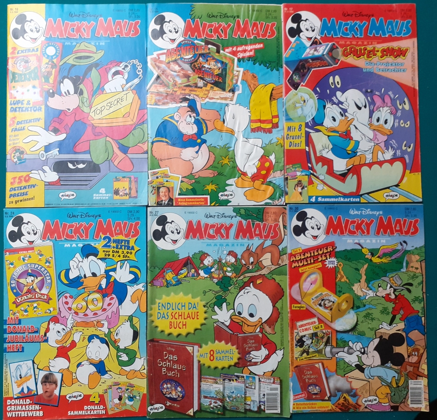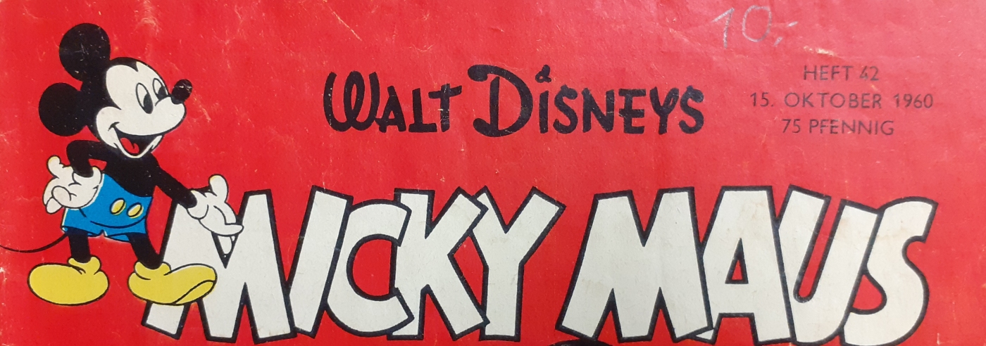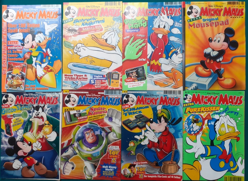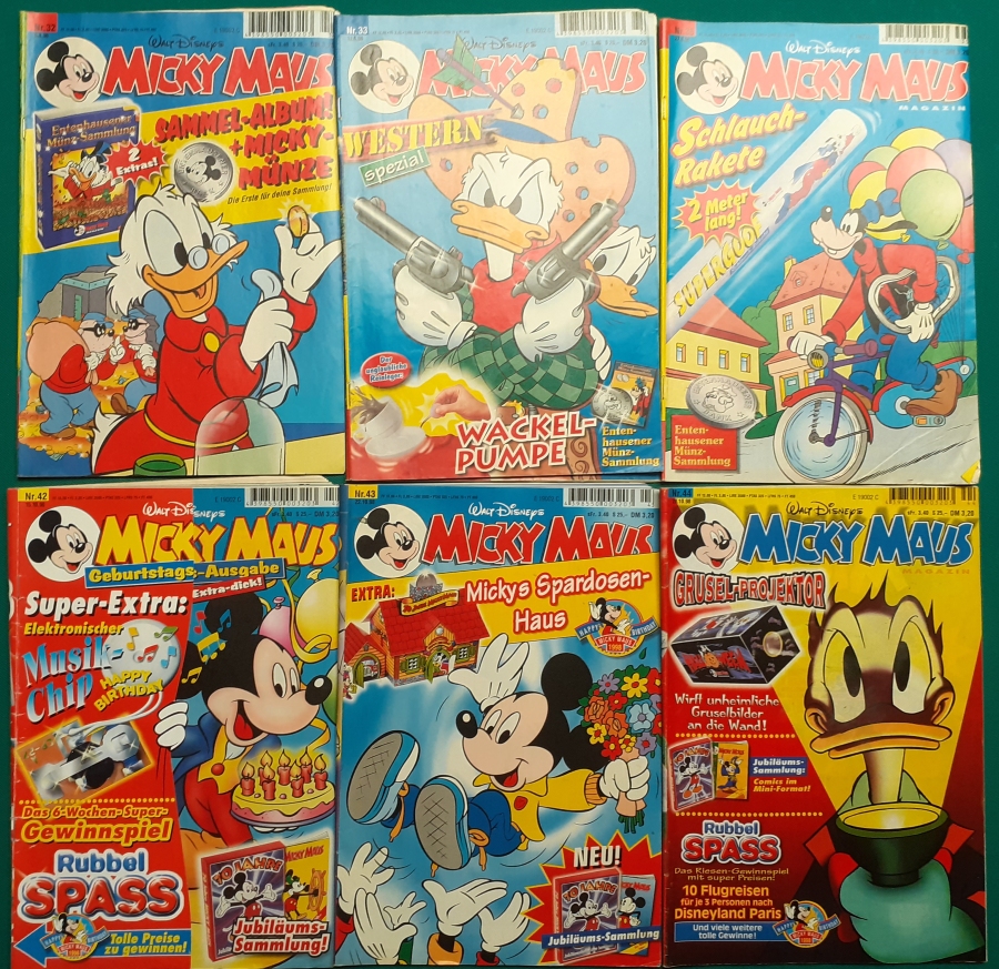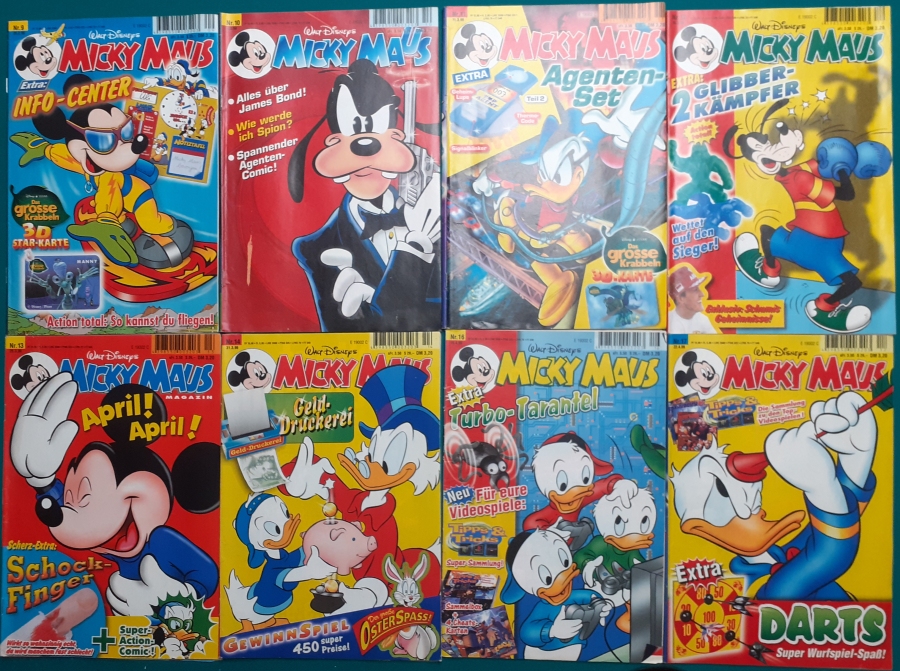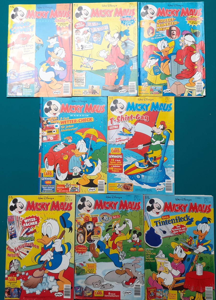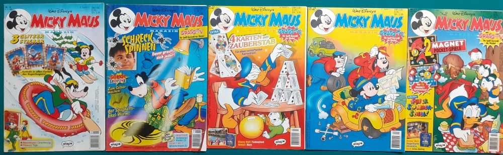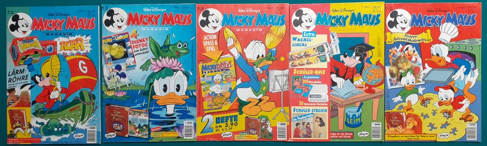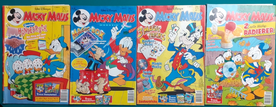 Erschienen im Ehapa Verlag, erscheint seit September 1951. Es handelt sich um normale Großbände im Format 26 x 17,5 cm. Der Umfang der Bände war jeweils ca. 32 Seiten, später 40 Seiten. Der Zeichner der Reihe ist Walt Disney. Im Mittelteil der Hefte befindet sich die ca. 15 seitige MMK-Zeitung (Micky Maus Klub) mit interessanten Berichten aus aller Welt und festen Rubriken, z.B. Wochenschau; Die gute Tat; jeweils zwei DIN A 7 große Fußballbilder von Profis aus der Fußball-Bundesliga mit kleinem Steckbrief; Fortsetzungs-Bildreportagen von Disney-Filmen, Preisausschreiben In den Bemerkungen zum Heft wird jeweils auf den Mittelteil Bezug genommen. Ab 1972 heißt das Mittelteil Micky Maus Magazin: neue Elemente sind z. B. 4 farbige Bildserie als Poster (DIN A 4 in Pappe) mit berühmten Disney-Figuren; Mickys Fußballalbum und Olympia-Album mit ganzseitigem Farbfoto mit Steckbrief. |