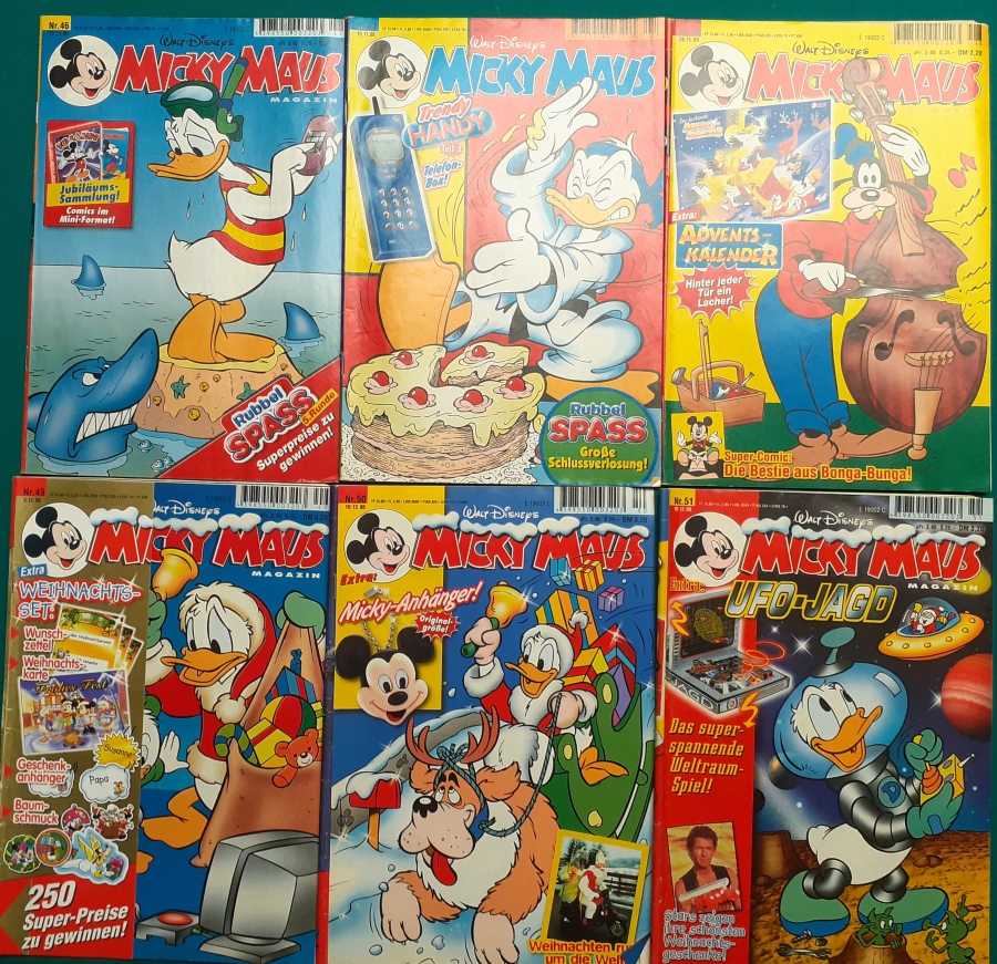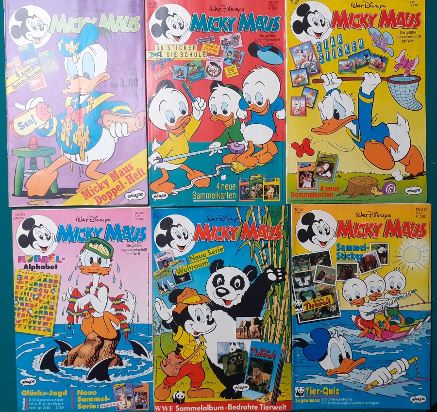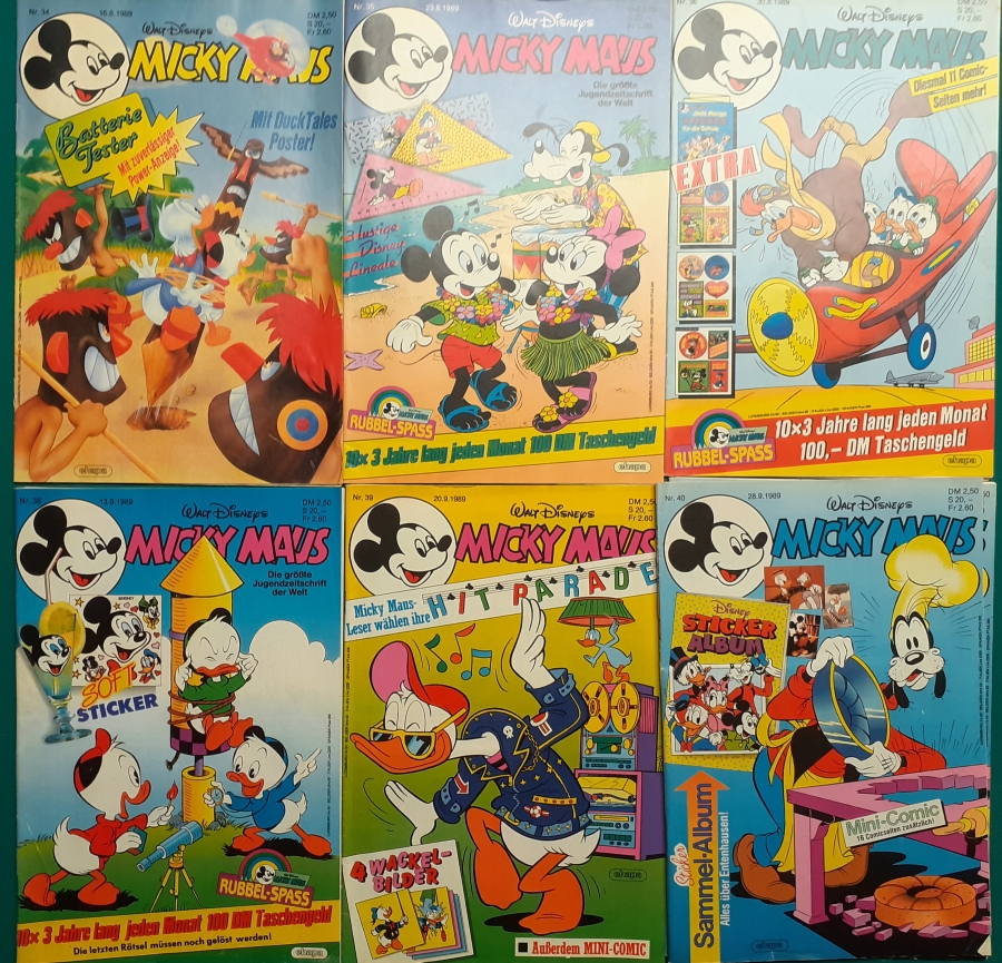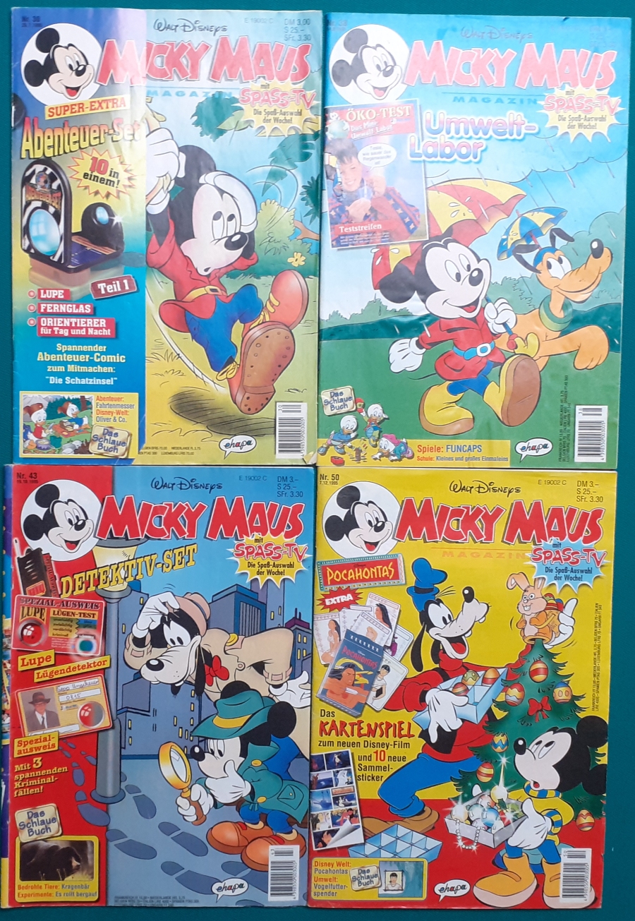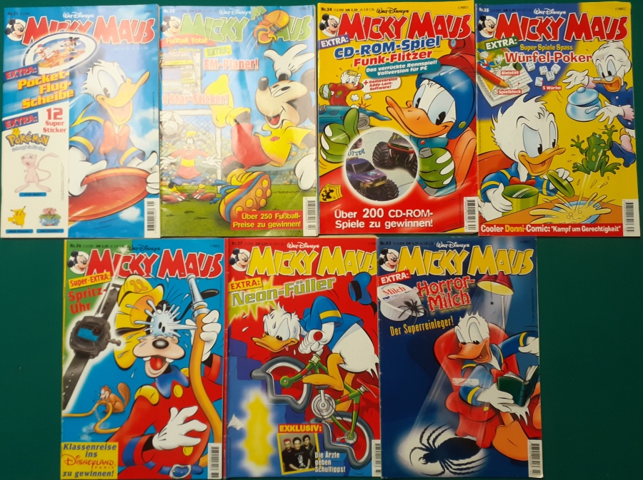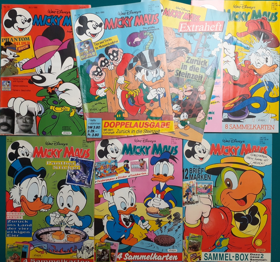 Erschienen im Ehapa Verlag, erscheint seit September 1951. Es handelt sich um normale Großbände im Format 26 x 17,5 cm. Der Umfang der Bände war jeweils ca. 32 Seiten, später 40 Seiten. Der Zeichner der Reihe ist Walt Disney. Im Mittelteil der Hefte befindet sich die ca. 15 seitige MMK-Zeitung (Micky Maus Klub) mit interessanten Berichten aus aller Welt und festen Rubriken, z.B. Wochenschau; Die gute Tat; jeweils zwei DIN A 7 große Fußballbilder von Profis aus der Fußball-Bundesliga mit kleinem Steckbrief; Fortsetzungs-Bildreportagen von Disney-Filmen, Preisausschreiben In den Bemerkungen zum Heft wird jeweils auf den Mittelteil Bezug genommen. Ab 1972 heißt das Mittelteil Micky Maus Magazin: neue Elemente sind z. B. 4 farbige Bildserie als Poster (DIN A 4 in Pappe) mit berühmten Disney-Figuren; Mickys Fußballalbum und Olympia-Album mit ganzseitigem Farbfoto mit Steckbrief. |