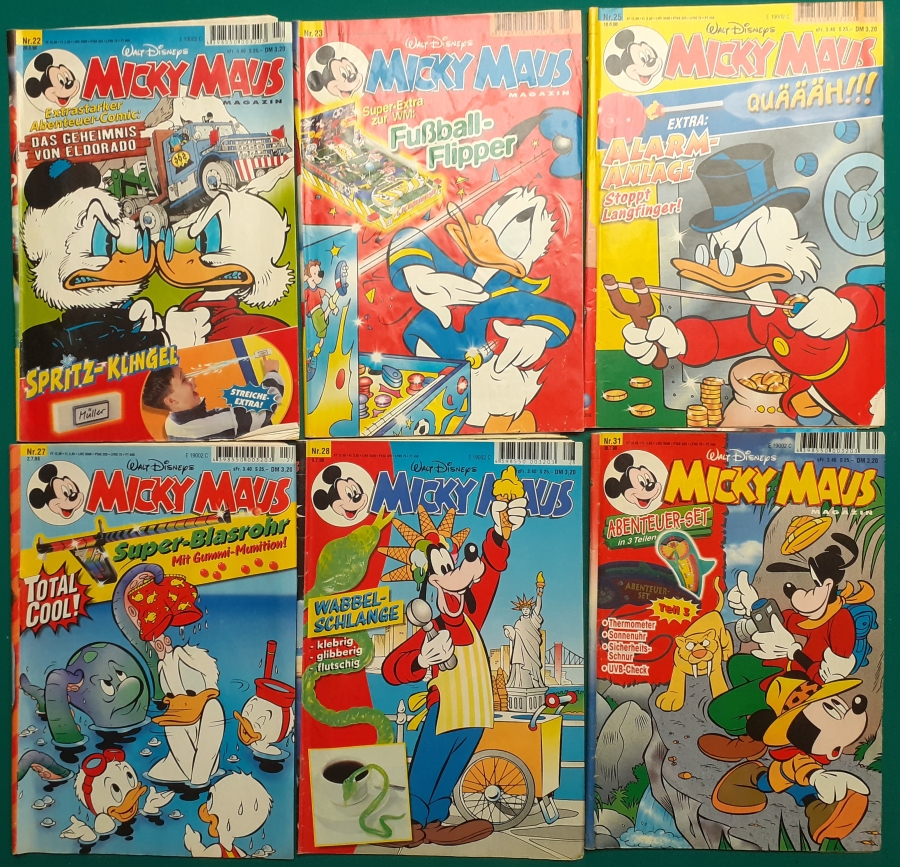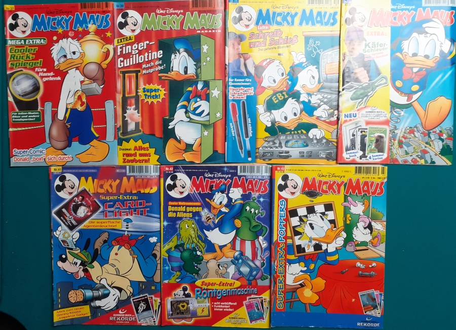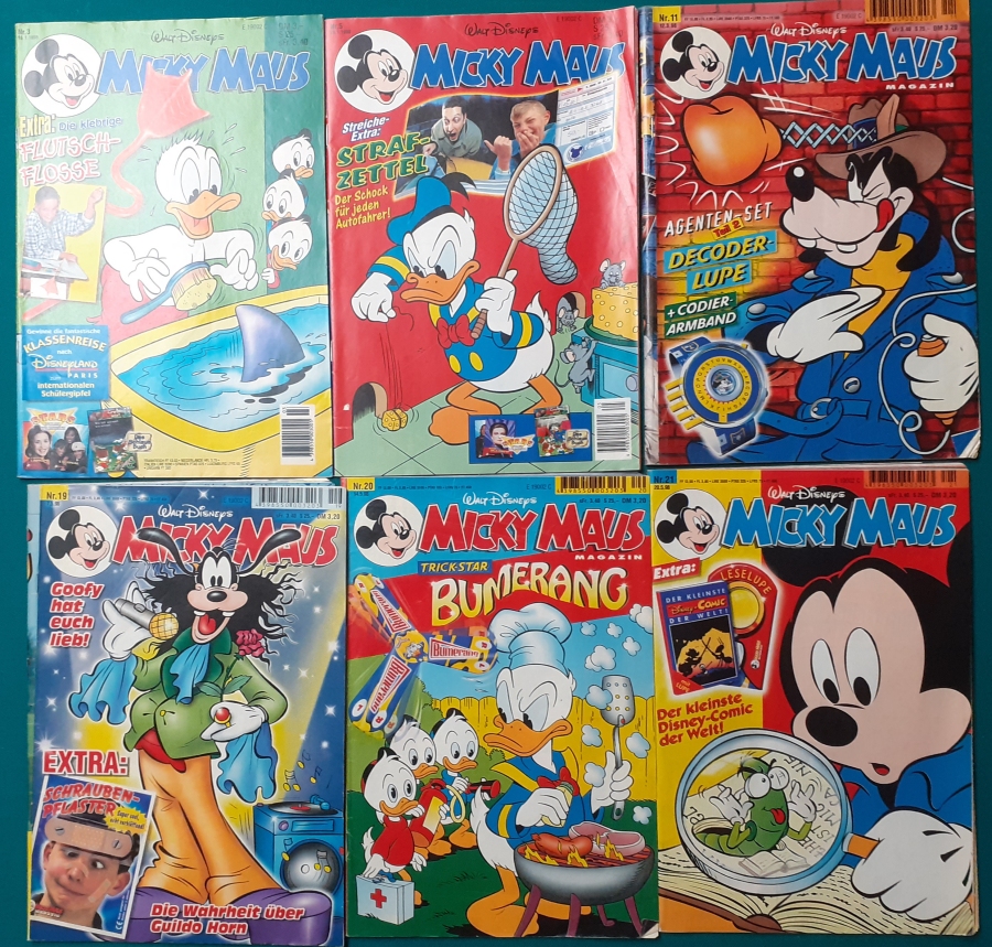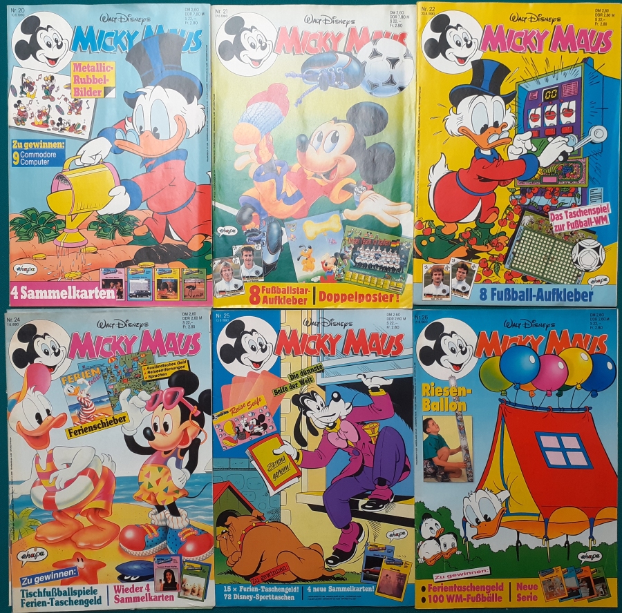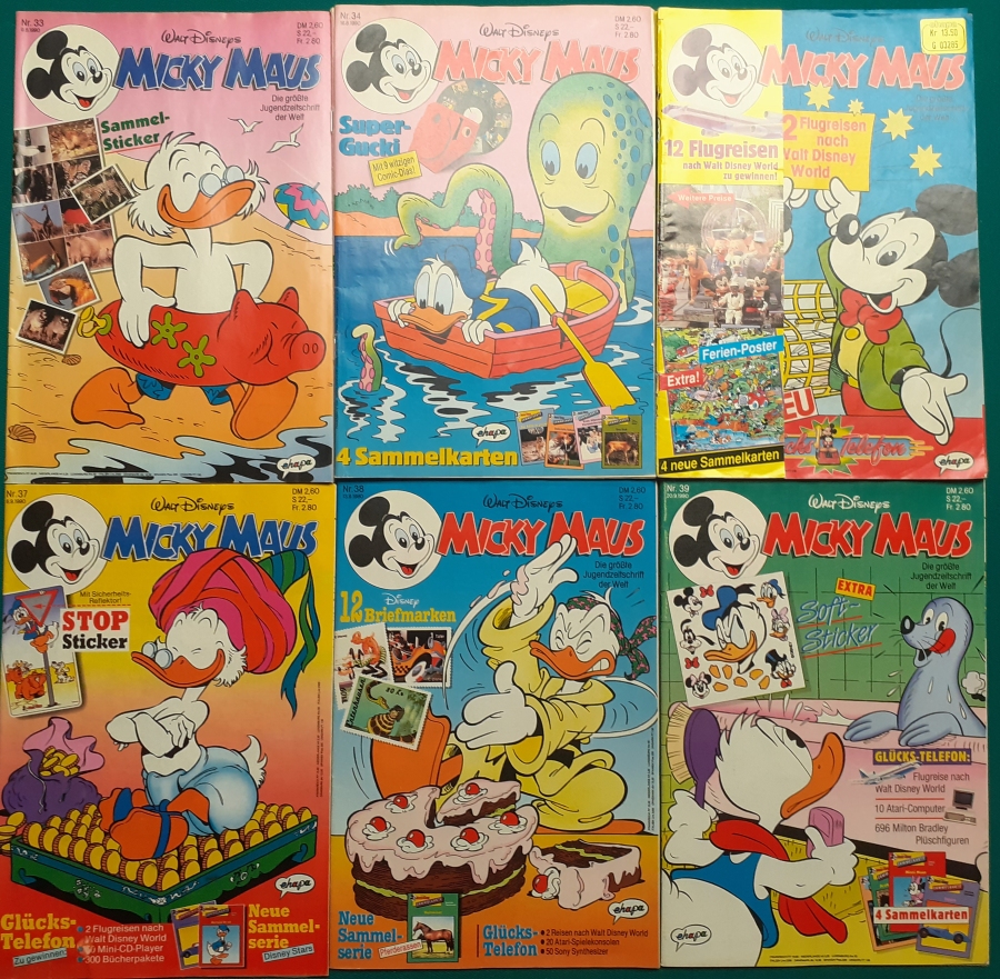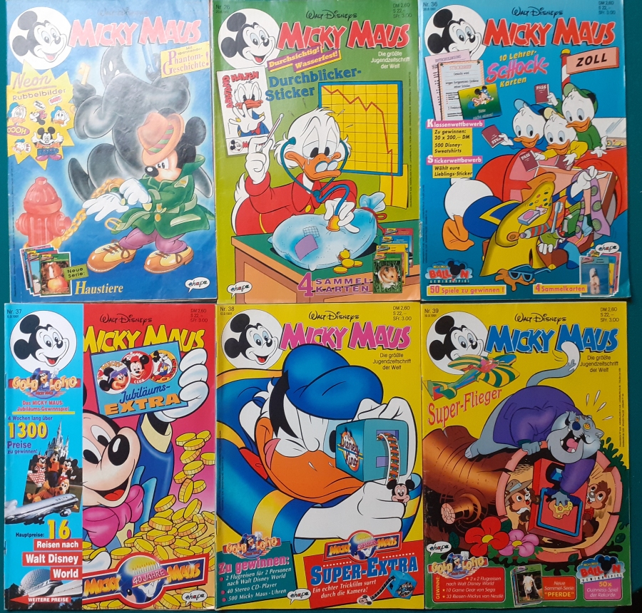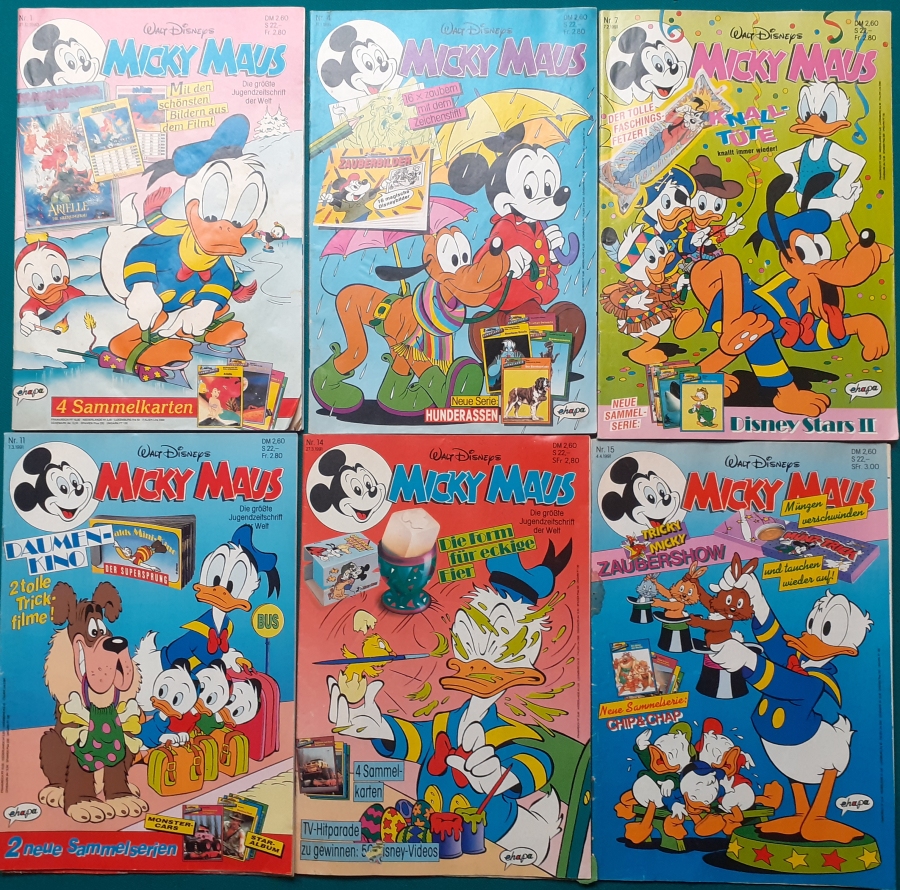 Erschienen im Ehapa Verlag, erscheint seit September 1951. Es handelt sich um normale Großbände im Format 26 x 17,5 cm. Der Umfang der Bände war jeweils ca. 32 Seiten, später 40 Seiten. Der Zeichner der Reihe ist Walt Disney. Im Mittelteil der Hefte befindet sich die ca. 15 seitige MMK-Zeitung (Micky Maus Klub) mit interessanten Berichten aus aller Welt und festen Rubriken, z.B. Wochenschau; Die gute Tat; jeweils zwei DIN A 7 große Fußballbilder von Profis aus der Fußball-Bundesliga mit kleinem Steckbrief; Fortsetzungs-Bildreportagen von Disney-Filmen, Preisausschreiben In den Bemerkungen zum Heft wird jeweils auf den Mittelteil Bezug genommen. Ab 1972 heißt das Mittelteil Micky Maus Magazin: neue Elemente sind z. B. 4 farbige Bildserie als Poster (DIN A 4 in Pappe) mit berühmten Disney-Figuren; Mickys Fußballalbum und Olympia-Album mit ganzseitigem Farbfoto mit Steckbrief. |