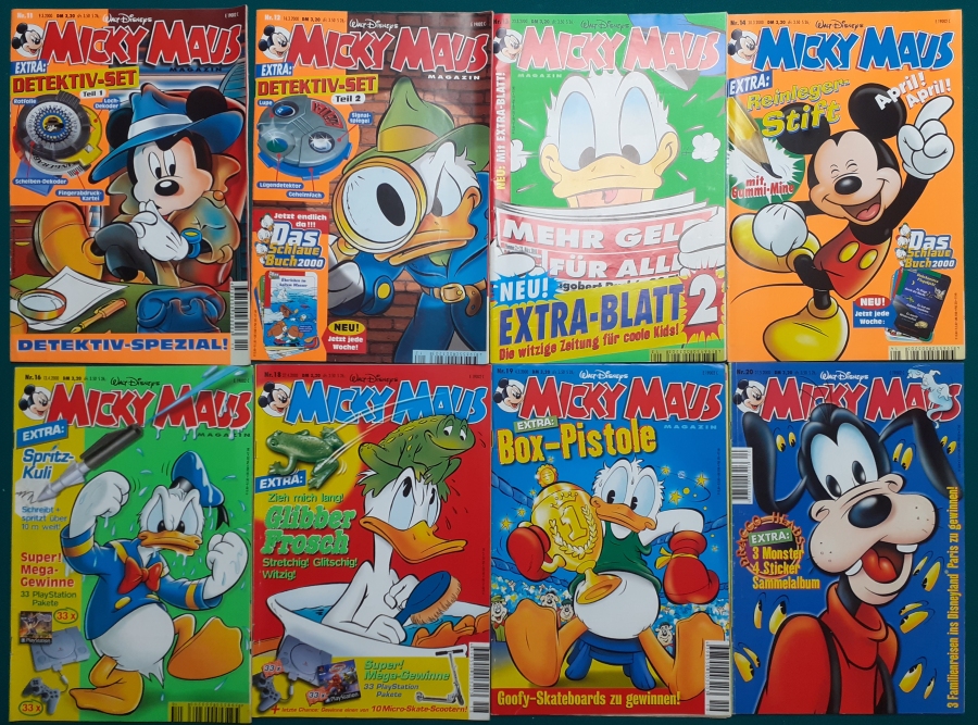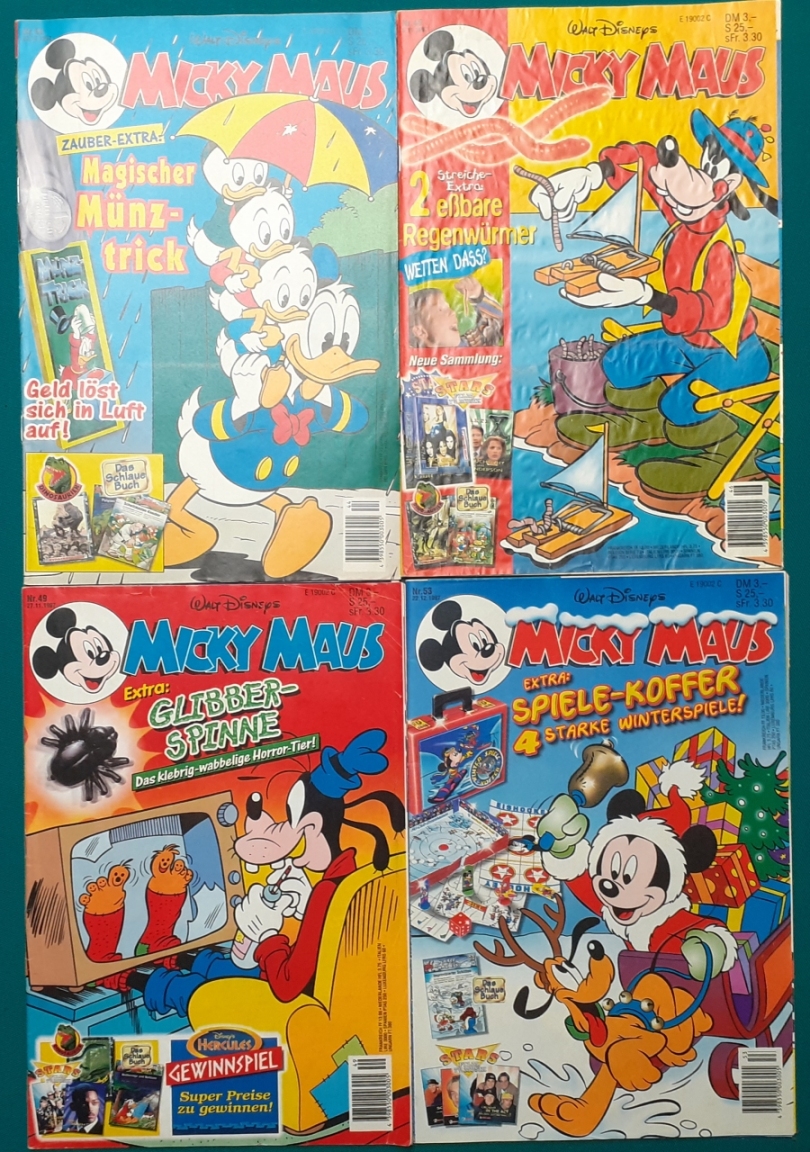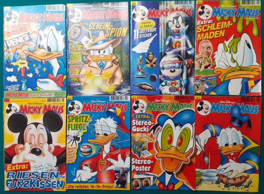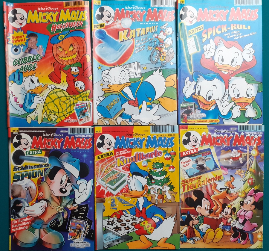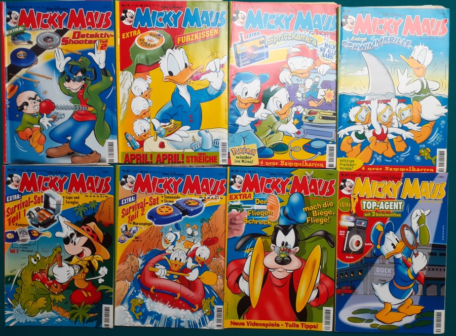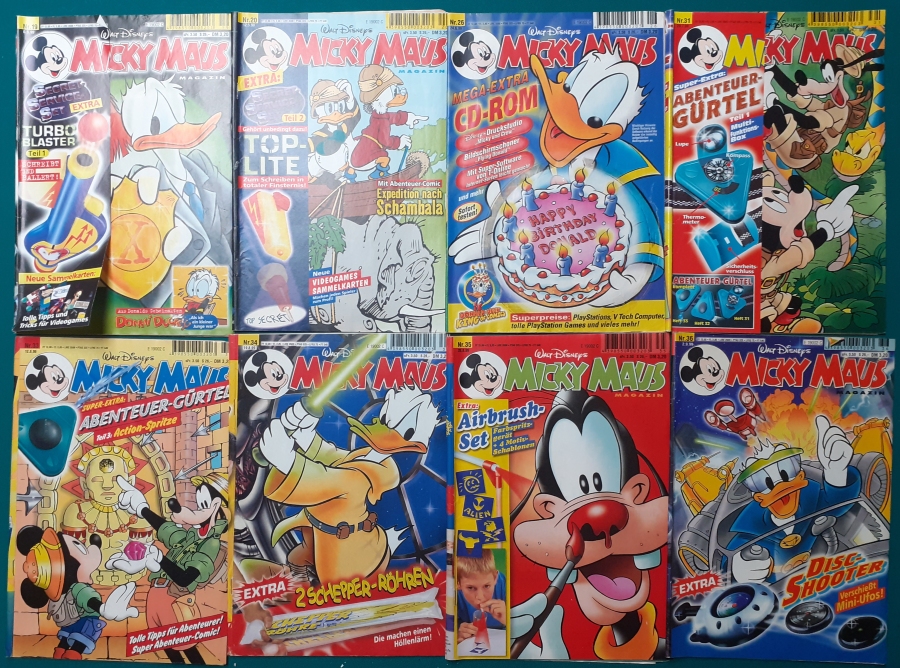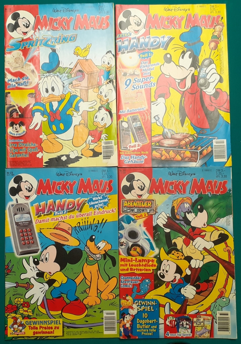 Erschienen im Ehapa Verlag, erscheint seit September 1951. Es handelt sich um normale Großbände im Format 26 x 17,5 cm. Der Umfang der Bände war jeweils ca. 32 Seiten, später 40 Seiten. Der Zeichner der Reihe ist Walt Disney. Im Mittelteil der Hefte befindet sich die ca. 15 seitige MMK-Zeitung (Micky Maus Klub) mit interessanten Berichten aus aller Welt und festen Rubriken, z.B. Wochenschau; Die gute Tat; jeweils zwei DIN A 7 große Fußballbilder von Profis aus der Fußball-Bundesliga mit kleinem Steckbrief; Fortsetzungs-Bildreportagen von Disney-Filmen, Preisausschreiben In den Bemerkungen zum Heft wird jeweils auf den Mittelteil Bezug genommen. Ab 1972 heißt das Mittelteil Micky Maus Magazin: neue Elemente sind z. B. 4 farbige Bildserie als Poster (DIN A 4 in Pappe) mit berühmten Disney-Figuren; Mickys Fußballalbum und Olympia-Album mit ganzseitigem Farbfoto mit Steckbrief. |