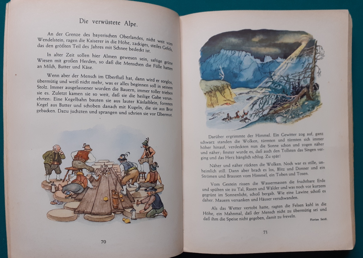 Bayerisches Lesebuch Bayerischer Schulbuchverlag München, 7. Auflage von 1957, 320 Seiten, von Fritz Färber (Hrsg.), wunderbare Illustrationen von Rainer Fluhme, Leinenrücken mit sehr festem Hardcover-Einband im Format 21,5 x 15 cm; Einband an den Buchkanten bestoßen, etwas fleckig und berieben; der Rücken war ursprünglich etwas beschädigt und wurde mit einem festen Klarsicht-Klebeband foliert; Buchblock war hinten am Gelenk gelockert und wurde im Nachsatz innen schonend mit Tesafilm stabilisiert; ansonsten Bindung ok. und alle Blätter fest; innen gepflegt und sauber; Illustrationen farbenfroh und sehr schön; insgesamt recht guter altersgemäßer Zustand, Preis: 24 EUR |