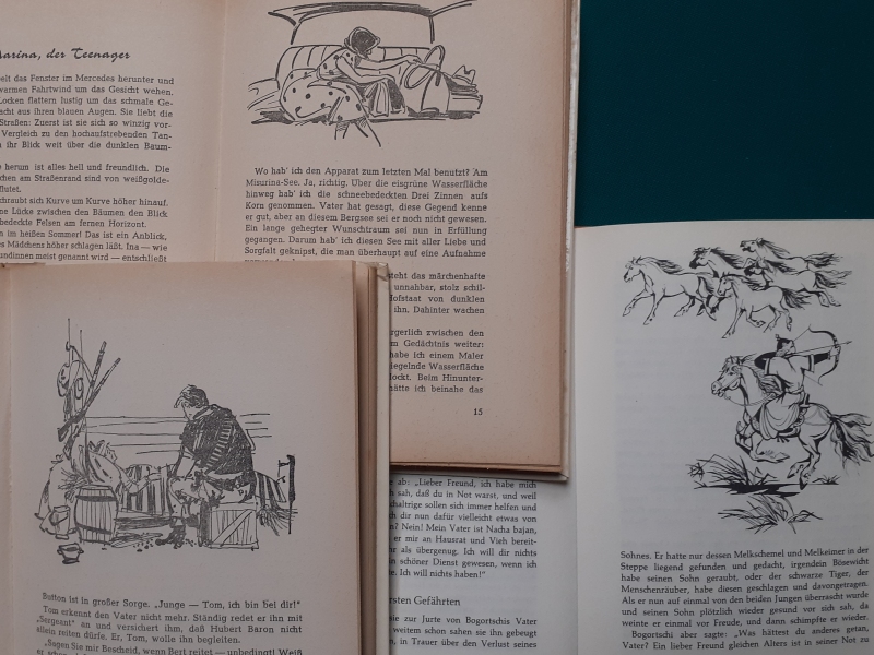 Zimmermann: Der grüne Reiter Eine Erzählung aus dem Fernen Westen nach historischen Quellen Großer GJB-Geschenkband mit Leinenrücken und lackiertem Einband; Erstausgabe um 1960, Illustrationen von Kurt Schmischke, 144 Seiten, altersgemäßer sehr guter Zustand, Preis: 6 EUR Hier zur Illustratoren-Galerie mit typischen Arbeiten von Kurt Schmischke