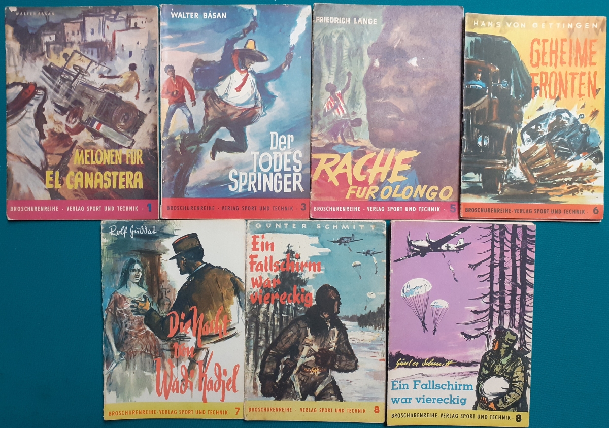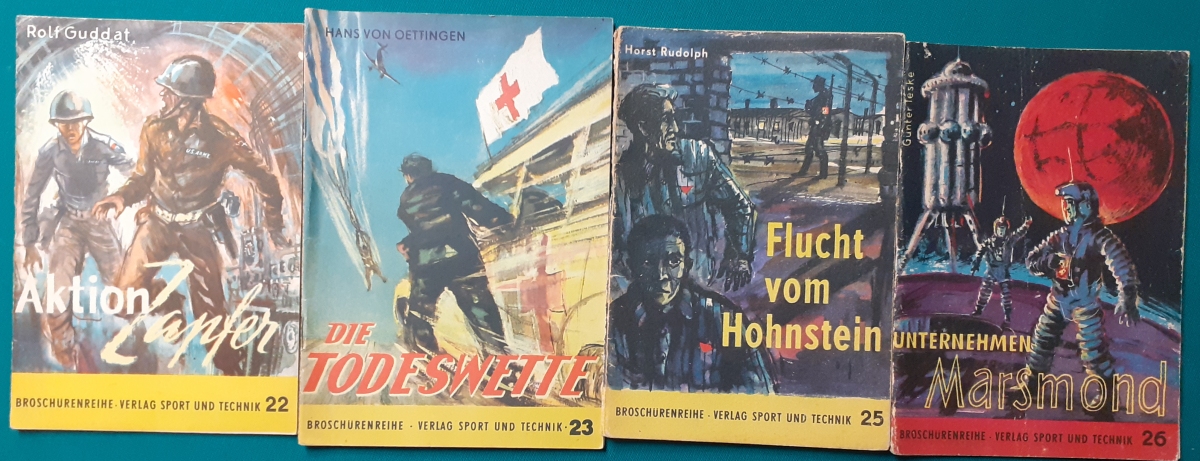 fortgesetzt. Siehe auch dort: Hier zur Kleinen Erzählerreihe ... Es erschienen außerdem 1957 6 Hefte unter der Bezeichnung "Broschürenreihe Technische Abenteuer" im etwas größeren Format 21 x 15 cm. Diese Hefte sind sehr selten und sind im Anschluß unten aufgeführt. |